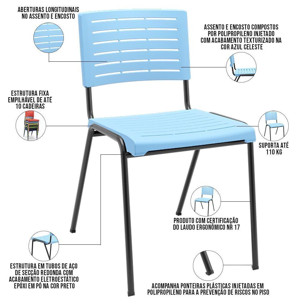 Kit 06 Cadeiras Empilhável Fixa Escritório Multiuso Base Preta Kimi P03 Azul Celeste - Lyam Decor