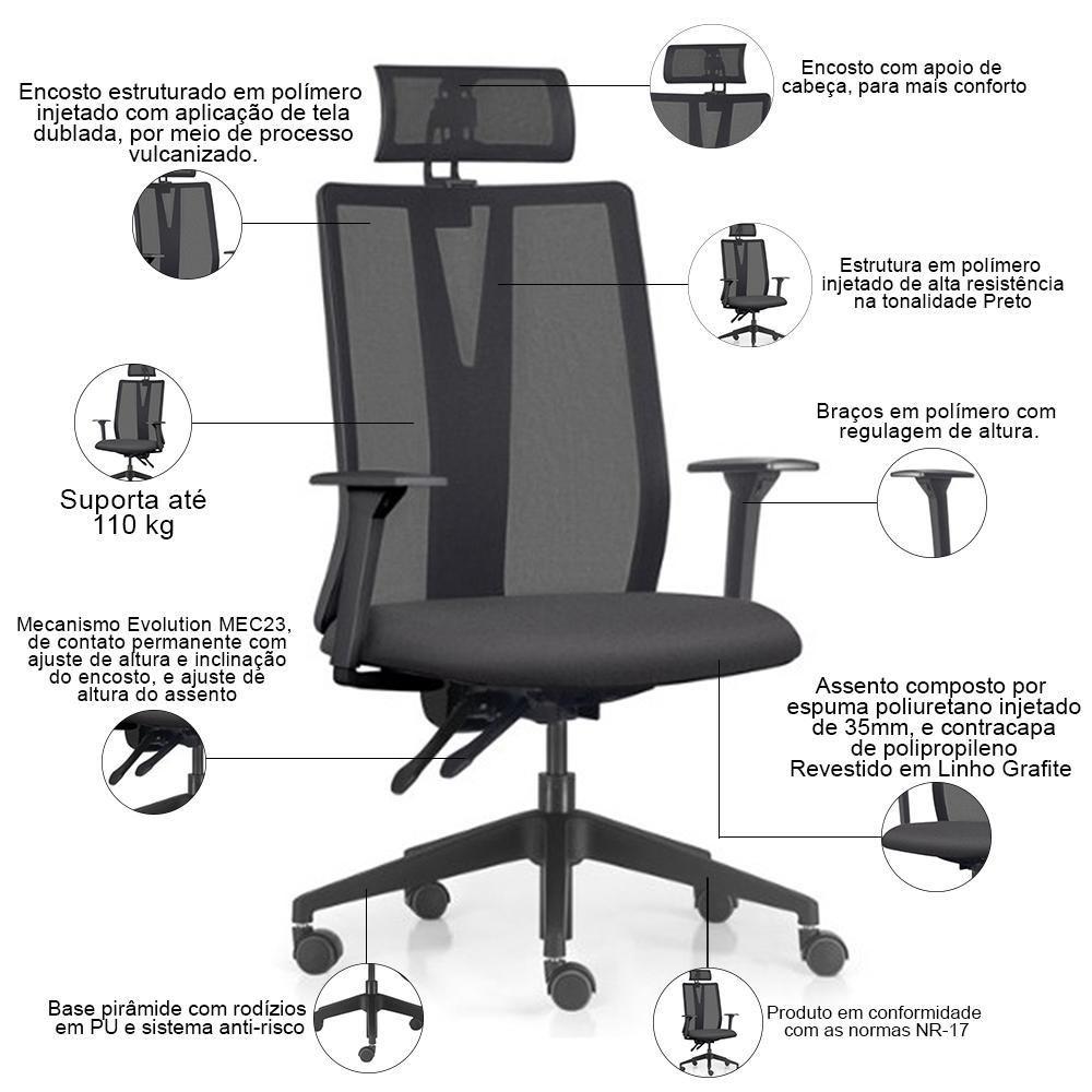 Kit 2 Cadeiras Escritório Giratória Presidente Flow F02 Base Preta Linho Grafite - Lyam DecorO Kit 02 Cadeiras de Escritório Presidente Flow, da Lyam Decor, se destaca como a verdadeiro protagonista do conforto e da produtividade. Com um design moderno que une estética e funcionalidade, essa cadeira se adapta perfeitamente ao seu estilo, seja no escritório convencional ou no aconchego do home office.Equipada com um mecanismo Evolution, um sistema de contato permanente, essa cadeira giratória abraça as suas necessidades, permitindo ajustes precisos na altura do assento, do encosto e dos braços. Cada detalhe foi pensado para proporcionar um suporte ideal, respeitando o biotipo do usuário e promovendo uma postura saudável durante longas horas de trabalho. Já a base pirâmide, adornada com rodízios em PU e sistema anti-risco, desliza suavemente sobre qualquer superfície, garantindo movimentos ágeis e seguros. Por fim, o encosto com apoio de cabeça completa a experiência, permitindo que você se concentre no que realmente importa, enquanto sua mente flui livremente. Com a cadeira presidente Flow sua jornada laboral será transformada em uma experiência prazerosa e produtiva. Sente-se, ajuste-se e deixe a inspiração fluir! Dimensões da Cadeira (L x A x P) 71 x 111 x 71 cm Medidas Internas: Altura máxima regulável: até 121,5 cm Altura regulável do chão ao assento: 44,5 a 54,5 cm Altura do chão aos braços: 62 a 72,5 cm Assento livre (L x P): 51 x 49 cm Encosto (L x A): 49 x 58 cm Encosto de cabeça (L x A): 29,4 x 13 cm Profundidade total com o encosto reclinado: 80 cm Características: Estrutura em polímero injetado de alta resistência na tonalidade Preta. Assento estofado com espuma injetada em poliuretano de 35mm e contracapa de polipropileno. Revestimento em tecido Linho de alta qualidade na tonalidade Grafite. Encosto estruturado em polímero injetado com aplicação de tela dublada, por meio de processo vulcanizado. Mecanismo Evolution MEC23, de contato permanente com ajuste de altura e inclinação do encosto, e ajuste de altura do assento, de acordo com o biotipo do usuário. Braços em polímero com regulagem de altura. Encosto com apoio de cabeça, para mais conforto. Base pirâmide com rodízios em PU e sistema anti-risco. Peso máximo suportado 110 kg, com uso recomendado de 8 horas diária. Produto em conformidade com as normas NR-17. - Por se tratar de estofado as medidas podem ter uma pequena variação de até 3 cm. - A tonalidade do produto real poderá ter ligeira variação devido o lote de tecidos. Observações importantes: - Produto para uso residencial em ambiente interno, não devendo ficar exposto diretamente ao sol, calor e umidade excessivos. - Pode haver alguma diferença de tonalidade entre a imagem e o produto real, por conta do tratamento de imagens e a calibração de cores do seu monitor. - As imagens são meramente ilustrativas, não acompanham objetos de decoração e eletrônicos. - Ao receber a mercadoria, o cliente deve verificar as condições da embalagem, caso haja alguma não assine o comprovante de recebimento e com nossa para orientações. - Montagem, desmontagem e outras instalações serão de responsabilidade do cliente. Não nos responsabilizamos, no ato da , por subir escadas/elevadores ou pelo transporte por guincho em apartamentos. Eventuais despesas são de responsabilidade do comprador. - Confira as dimensões do produto e certifique-se de que passará normalmente por supostos elevadores, portas, escadas e/ou corredores de sua residência. - Para mais informações, acesse nossa Central de Atendimento. Color: PretoGrafite | ColorFamily: Preto | ColorSimple: Preto | ColorSupplier: PretoGrafite | Com apoio de braços: Sim | Com aro para pés: Não | Com rodas: Sim | Cor: PretoGrafite | Formato de venda: Kit 2 unidades | Materiais do aro para pés: na | Material: Polímero injetado, espuma injetada, tela dublada vulcanizada, rodízios em PU, revestimento em Linho | Material do estofamento: Espuma Injetada em Poliuretano 35mm | MaterialFamily: Polímero | Model: Flow Presidente | Modelo: Flow Presidente | Modelo detalhado: Flow Presidente | OriginCountry: Brasil | OriginState: PR | ProductContents: 02 Cadeiras de Escritório | ProductHeight: 111 cm | ProductInstructions: Produto para uso em ambiente interno, nao devendo ficar exposto ao sol, calor e umidade excessivos. | ProductLength: 71 cm | ProductWarranty: 90 dias após o recebimento do produto | ProductWeight: 13 kg | ProductWidth: 71 cm | Requer montagem: Sim | SizeDescription: Altura: 111 cm x Largura: 71 cm x Profundidade: 71 cm | SupplierSimpleName: Kit 2 Cadeiras Escritório Giratória Presidente Flow F02 Base Preta Linho Grafite - Lyam Decor | Tipo de cadeira de escritório: Presidente Giratória