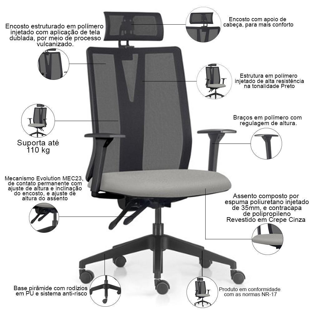 Kit 2 Cadeiras Escritório Giratória Presidente Flow F02 Base Preta Crepe Cinza - Lyam DecorO Kit 02 Cadeiras de Escritório Presidente Flow, da Lyam Decor, se destaca como a verdadeiro protagonista do conforto e da produtividade. Com um design moderno que une estética e funcionalidade, essa cadeira se adapta perfeitamente ao seu estilo, seja no escritório convencional ou no aconchego do home office.Equipada com um mecanismo Evolution, um sistema de contato permanente, essa cadeira giratória abraça as suas necessidades, permitindo ajustes precisos na altura do assento, do encosto e dos braços. Cada detalhe foi pensado para proporcionar um suporte ideal, respeitando o biotipo do usuário e promovendo uma postura saudável durante longas horas de trabalho. Já a base pirâmide, adornada com rodízios em PU e sistema anti-risco, desliza suavemente sobre qualquer superfície, garantindo movimentos ágeis e seguros. Por fim, o encosto com apoio de cabeça completa a experiência, permitindo que você se concentre no que realmente importa, enquanto sua mente flui livremente. Com a cadeira presidente Flow sua jornada laboral será transformada em uma experiência prazerosa e produtiva. Sente-se, ajuste-se e deixe a inspiração fluir! Dimensões da Cadeira (L x A x P) 71 x 111 x 71 cm Medidas Internas: Altura máxima regulável: até 121,5 cm Altura regulável do chão ao assento: 44,5 a 54,5 cm Altura do chão aos braços: 62 a 72,5 cm Assento livre (L x P): 51 x 49 cm Encosto (L x A): 49 x 58 cm Encosto de cabeça (L x A): 29,4 x 13 cm Profundidade total com o encosto reclinado: 80 cm Características: Estrutura em polímero injetado de alta resistência na tonalidade Preta. Assento estofado com espuma injetada em poliuretano de 35mm e contracapa de polipropileno. Revestimento em tecido Crepe de alta qualidade na tonalidade Cinza. Encosto estruturado em polímero injetado com aplicação de tela dublada, por meio de processo vulcanizado. Mecanismo Evolution MEC23, de contato permanente com ajuste de altura e inclinação do encosto, e ajuste de altura do assento, de acordo com o biotipo do usuário. Braços em polímero com regulagem de altura. Encosto com apoio de cabeça, para mais conforto. Base pirâmide com rodízios em PU e sistema anti-risco. Peso máximo suportado 110 kg, com uso recomendado de 8 horas diária. Produto em conformidade com as normas NR-17. - Por se tratar de estofado as medidas podem ter uma pequena variação de até 3 cm. - A tonalidade do produto real poderá ter ligeira variação devido o lote de tecidos. Observações importantes: - Produto para uso residencial em ambiente interno, não devendo ficar exposto diretamente ao sol, calor e umidade excessivos. - Pode haver alguma diferença de tonalidade entre a imagem e o produto real, por conta do tratamento de imagens e a calibração de cores do seu monitor. - As imagens são meramente ilustrativas, não acompanham objetos de decoração e eletrônicos. - Ao receber a mercadoria, o cliente deve verificar as condições da embalagem, caso haja alguma não assine o comprovante de recebimento e com nossa para orientações. - Montagem, desmontagem e outras instalações serão de responsabilidade do cliente. Não nos responsabilizamos, no ato da , por subir escadas/elevadores ou pelo transporte por guincho em apartamentos. Eventuais despesas são de responsabilidade do comprador. - Confira as dimensões do produto e certifique-se de que passará normalmente por supostos elevadores, portas, escadas e/ou corredores de sua residência. - Para mais informações, acesse nossa Central de Atendimento. Color: PretoCinza | ColorFamily: Preto | ColorSimple: Preto | ColorSupplier: PretoCinza | Com apoio de braços: Sim | Com aro para pés: Não | Com rodas: Sim | Cor: PretoCinza | Formato de venda: Kit 2 unidades | Materiais do aro para pés: na | Material: Polímero injetado, espuma injetada, tela dublada vulcanizada, rodízios em PU, revestimento em Crepe | Material do estofamento: Espuma Injetada em Poliuretano 35mm | MaterialFamily: Polímero | Model: Flow Presidente | Modelo: Flow Presidente | Modelo detalhado: Flow Presidente | OriginCountry: Brasil | OriginState: PR | ProductContents: 02 Cadeiras de Escritório | ProductHeight: 111 cm | ProductInstructions: Produto para uso em ambiente interno, nao devendo ficar exposto ao sol, calor e umidade excessivos. | ProductLength: 71 cm | ProductWarranty: 90 dias após o recebimento do produto | ProductWeight: 13 kg | ProductWidth: 71 cm | Requer montagem: Sim | SizeDescription: Altura: 111 cm x Largura: 71 cm x Profundidade: 71 cm | SupplierSimpleName: Kit 2 Cadeiras Escritório Giratória Presidente Flow F02 Base Preta Crepe Cinza - Lyam Decor | Tipo de cadeira de escritório: Presidente Giratória