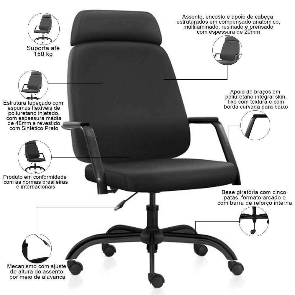 Kit 02 Cadeiras De Escritório Giratória Com Apoio De Cabeça Hub F02 Sintético Preto - Lyam Decor