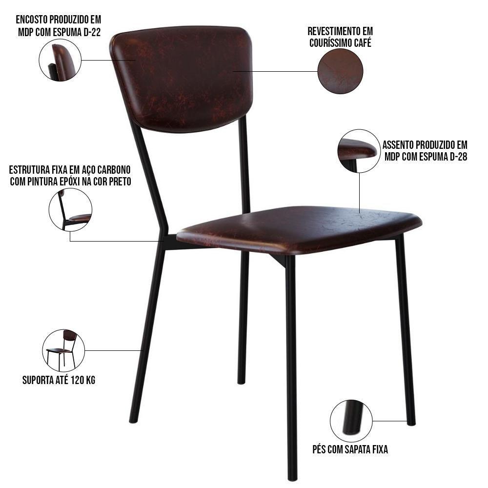 Kit 08 Cadeira Para Sala De Jantar Village Preto C01 Courino Café - Lyam DecorDesfrute de momentos inesquecíveis com o Kit 08 Cadeiras Village, projetada para oferecer o máximo de conforto e elegância com seu estilo retrô. Com sua estrutura de aço na tonalidade preto e assento e encosto estofados com materiais de altíssima qualidade, ela proporciona suporte ideal para longas refeições e conversas agradáveis. Além de combinar durabilidade e estilo, ela é a escolha perfeita para quem busca sofisticação e bem-estar em cada detalhe. Transforme sua sala de jantar com a nossa Cadeira Village. Aproveite!Dimensões da Cadeira (L x A x P)43 x 83 x 53 cmAltura do chão ao assento: 49 cmLargura do encosto: 42 cmAltura do encosto: 23 cmCaracterísticas:Estrutura fixa em aço carbono com pintura epóxi na cor preto.Encosto produzido em MDP com espuma D-22.Assento produzido em MDP com espuma D-28.Revestimento em Courino na cor Café.Pés com sapatas fixa.Peso suportado de até 120 kg.- Por se tratar de estofado as medidas podem ter uma pequena variação de até 3 cm.- A tonalidade do produto real poderá ter ligeira variação devido o lote de tecidos.- A limpeza deve ser feita com pano levemente umedecido em água limpa, sem esfregar, não utilizar produtos abrasivos, desengordurantes, álcool ou solvente.Observações importantes:- Produto para uso residencial em ambiente interno, não devendo ficar exposto diretamente ao sol, calor e umidade excessivos.- Pode haver alguma diferença de tonalidade entre a imagem e o produto real, por conta do tratamento de imagens e a calibração de cores do seu monitor.- As imagens são meramente ilustrativas, não acompanham objetos de decoração e eletrônicos.- Ao receber a mercadoria, o cliente deve verificar as condições da embalagem, caso haja alguma não assine o de .- Montagem, desmontagem e outras instalações serão de responsabilidade do cliente. Não nos responsabilizamos, no ato da , por subir escadas/elevadores ou pelo por guincho em apartamentos. Eventuais despesas são de responsabilidade do comprador.- Confira as dimensões do produto e certifique-se de que passará normalmente por supostos elevadores, portas, escadas e/ou corredores de sua residência.Color: Marrom | ColorFamily: Marrom | ColorSimple: Marrom | ColorSupplier: Café | Material: Estrutura em Aço, MDP, Revestimento em Couro sintético e espuma | MaterialFamily: Aço, MDP, Couro sintético e espuma | Model: Village | OriginCountry: | OriginState: PR | ProductContents: 08 Cadeiras | ProductHeight: 249 cm | ProductInstructions: Produto para uso em ambiente interno, nao devendo ficar exposto ao sol, calor e umidade excessivos. | ProductLength: 53 cm | ProductWarranty: 90 dias após o do produto | ProductWeight: 52 kg | ProductWidth: 43 cm | SizeDescription: Altura: 249 cm x Largura: 43 cm x Profundidade: 53cm | SupplierSimpleName: Kit 08 Cadeira Para Sala de Jantar Village Preto C01 Courino Café - Lyam Decor