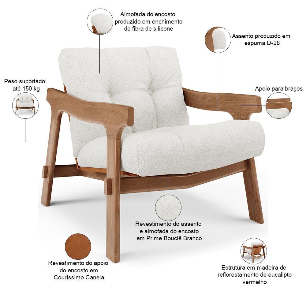 Kit 02 Poltronas Decorativa Fixa Para Sala Living Ikary L02 Canela Prime Bouclê Branco - Lyam DecorO Kit 02 Poltronas Ikary é a escolha ideal para quem busca unir sofisticação e funcionalidade. Com seu design contemporâneo, ela transforma qualquer ambiente, seja na sala de estar, no quarto ou no escritório. Revestida com materiais de alta qualidade e sua estrutura de madeira de eucalipto vermelho, garante o conforto e estilo, além de proporcionar resistência e sustentabilidade. Leve elegância e praticidade para sua casa com a Poltrona Ikary. Um móvel que une design contemporâneo e durabilidade para transformar o seu ambiente!Dimensões do produto (A x L x P) 74 x 92 x 64 cmMedidas Internas: Altura do chão ao assento: 41 cm Altura do chão ao braço: 59cm- Por se tratar de estofado as medidas podem ter uma pequena variação de até 3 cm. - A tonalidade do produto real poderá ter ligeira variação devido o lote de tecidos. - A limpeza deve ser feita com pano levemente umedecido em água limpa, sem esfregar, não utilizar produtos abrasivos, desengordurantes, álcool ou solvente.Características: Estrutura em madeira de reflorestamento de eucalipto vermelho, proporcionando resistência e sustentabilidade. Possui apoio para os braços. Almofada do encosto produzida com enchimento de fibra de silicone, garantindo maciez. Assento confeccionado com espuma D-28. Revestimento do assento e da almofada do encosto em Bouclê na cor Branco. Apoio do encosto em Couríssimo na cor Canela, adicionando um detalhe elegante. Suporta até 150 kg.Observações importantes: - Produto para uso residencial em ambiente interno, não devendo ficar exposto diretamente ao sol, calor e umidade excessivos. - Pode haver alguma diferença de tonalidade entre a imagem e o produto real, por conta do tratamento de imagens e a calibração de cores do seu monitor. - As imagens são meramente ilustrativas, não acompanham objetos de decoração e eletrônicos. - Ao receber a mercadoria, o cliente deve verificar as condições da embalagem, caso haja alguma avaria não assine o comprovante de recebimento. - Montagem, desmontagem e outras instalações serão de responsabilidade do cliente. Não nos responsabilizamos, no ato da entrega, por subir escadas/elevadores ou pelo transporte por guincho em apartamentos. Eventuais despesas são de responsabilidade do comprador. - Confira as dimensões do produto e certifique-se de que passará normalmente por supostos elevadores, portas, escadas e/ou corredores de sua residência. ProductWeight: 50 kg | Color: Branco | ColorFamily: Branco | ColorSimple: Branco | ColorSupplier: Canela e Branco | Material: Estrutura em Madeira, Espuma, Revestimento Couríssimo e Bouclê | MaterialFamily: Madeira, Espuma | Model: Ikary | OriginCountry: Nacional | OriginState: PR | ProductContents: 02 Poltronas | SizeDescription: Altura: 100 cm x Largura: 85 cm x Profundidade: 100 cm | SupplierSimpleName: Kit 02 Poltronas Decorativa Fixa Para Sala Living Ikary L02 Canela Prime Bouclê Branco - Lyam Decor | ProductLength: 100 cm | ProductWidth: 85 cm | ProductWarranty: 90 dias após o recebimento do produto | ProductHeight: 100 cm | ProductInstructions: Produto para uso em ambiente interno, nao devendo ficar exposto ao sol, calor e umidade excessivos.