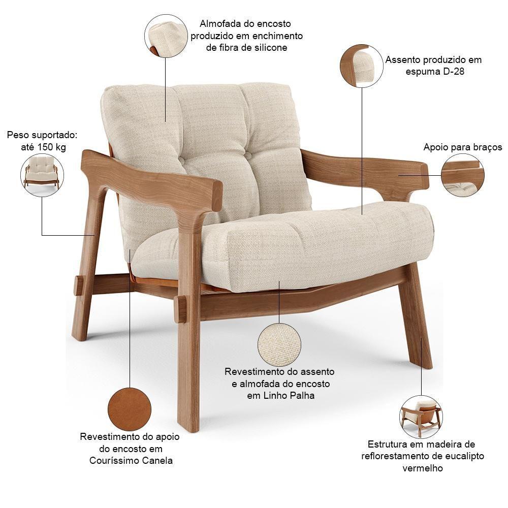 Kit 04 Poltronas Decorativa Fixa Para Sala Living Ikary L02 Canela Linho Palha - Lyam DecorO Kit 04 Poltronas Ikary é a escolha ideal para quem busca unir sofisticação e funcionalidade. Com seu design contemporâneo, ela transforma qualquer ambiente, seja na sala de estar, no quarto ou no escritório. Revestida com materiais de alta qualidade e sua estrutura de madeira de eucalipto vermelho, garante o conforto e estilo, além de proporcionar resistência e sustentabilidade. Leve elegância e praticidade para sua casa com a Poltrona Ikary. Um móvel que une design contemporâneo e durabilidade para transformar o seu ambiente!Dimensões do produto (A x L x P) 74 x 92 x 64 cmMedidas Internas: Altura do chão ao assento: 41 cm Altura do chão ao braço: 59cm- Por se tratar de estofado as medidas podem ter uma pequena variação de até 3 cm. - A tonalidade do produto real poderá ter ligeira variação devido o lote de tecidos. - A limpeza deve ser feita com pano levemente umedecido em água limpa, sem esfregar, não utilizar produtos abrasivos, desengordurantes, álcool ou solvente.Características: Estrutura em madeira de reflorestamento de eucalipto vermelho, proporcionando resistência e sustentabilidade. Possui apoio para os braços. Almofada do encosto produzida com enchimento de fibra de silicone, garantindo maciez. Assento confeccionado com espuma D-28. Revestimento do assento e da almofada do encosto em Linho na cor Palha. Apoio do encosto em Couríssimo na cor Canela, adicionando um detalhe elegante. Suporta até 150 kg.Observações importantes: - Produto para uso residencial em ambiente interno, não devendo ficar exposto diretamente ao sol, calor e umidade excessivos. - Pode haver alguma diferença de tonalidade entre a imagem e o produto real, por conta do tratamento de imagens e a calibração de cores do seu monitor. - As imagens são meramente ilustrativas, não acompanham objetos de decoração e eletrônicos. - Ao receber a mercadoria, o cliente deve verificar as condições da embalagem, caso haja alguma avaria não assine o comprovante de recebimento. - Montagem, desmontagem e outras instalações serão de responsabilidade do cliente. Não nos responsabilizamos, no ato da entrega, por subir escadas/elevadores ou pelo transporte por guincho em apartamentos. Eventuais despesas são de responsabilidade do comprador. - Confira as dimensões do produto e certifique-se de que passará normalmente por supostos elevadores, portas, escadas e/ou corredores de sua residência. ProductWeight: 75 kg | Color: Palha | ColorFamily: Palha | ColorSimple: Palha | ColorSupplier: Canela e Palha | Material: Estrutura em Madeira, Espuma, Revestimento Couríssimo e Linho | MaterialFamily: Madeira, Espuma | Model: Ikary | OriginCountry: Nacional | OriginState: PR | ProductContents: 04 Poltronas | SizeDescription: Altura: 150 cm x Largura: 85 cm x Profundidade: 150 cm | SupplierSimpleName: Kit 04 Poltronas Decorativa Fixa Para Sala Living Ikary L02 Canela Linho Palha - Lyam Decor | ProductLength: 150 cm | ProductWidth: 85 cm | ProductWarranty: 90 dias após o recebimento do produto | ProductHeight: 150 cm | ProductInstructions: Produto para uso em ambiente interno, nao devendo ficar exposto ao sol, calor e umidade excessivos.
