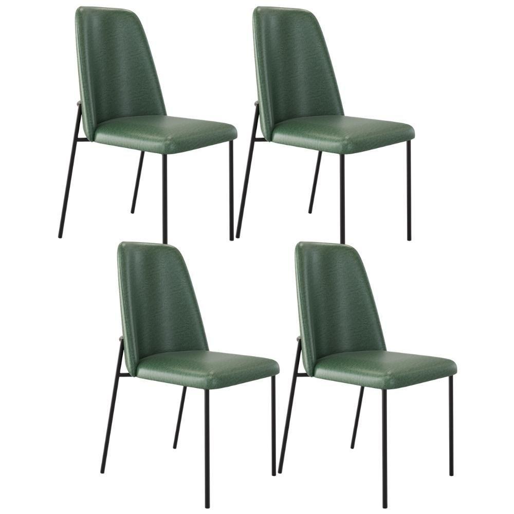 Kit 04 Cadeiras Decorativa Estofada Para Sala De Jantar Bella L02 Couríssimo Verde - Lyam DecorO Kit 04 Cadeiras Bella é o equilíbrio perfeito entre estilo sofisticado, conforto e funcionalidade. Projetada para se destacar em qualquer ambiente, seja na sala de jantar, recepção ou em ambiente comercial, esta peça é ideal para quem quer investir em conforto e beleza. Produzida com materiais de alta qualidade e acabamento impecável, seu visual contemporâneo e detalhes cuidadosamente elaborados, a cadeira Bella transforma qualquer espaço, trazendo charme e praticidade ao dia a dia. Adquira já a sua!!Dimensões da Poltrona (L x A x P) 47 x 89 x 52 cmMedidas Internas: Altura do chão ao assento: 48 cmCaracterísticas: Estrutura fixa em aço carbono com pintura epóxi na cor Preto. Revestimento em Couríssimo na cor Verde. Encosto e assento estofados com espuma D-23. Suporta até 120 kg.- Por se tratar de estofado as medidas podem ter uma pequena variação de até 3 cm. - A tonalidade do produto real poderá ter ligeira variação devido o lote de tecidos. - Indicado para uso residencial, sua limpeza deve ser feita com pano levemente umedecido em água limpa, sem esfregar, não utilizar produtos abrasivos, desengordurantes, álcool ou solvente.Observações importantes: - Produto para uso residencial em ambiente interno, não devendo ficar exposto diretamente ao sol, calor e umidade excessivos. - Pode haver alguma diferença de tonalidade entre a imagem e o produto real, por conta do tratamento de imagens e a calibração de cores do seu monitor. - As imagens são meramente ilustrativas, não acompanham objetos de decoração e eletrônicos. - Ao receber a mercadoria, o cliente deve verificar as condições da embalagem, caso haja alguma avaria não assine o comprovante de recebimento e entre em contato com nossa loja para orientações. - Montagem, desmontagem e outras instalações serão de responsabilidade do cliente. Não nos responsabilizamos, no ato da entrega, por subir escadas/elevadores ou pelo transporte por guincho em apartamentos. Eventuais despesas são de responsabilidade do comprador. - Confira as dimensões do produto e certifique-se de que passará normalmente por supostos elevadores, portas, escadas e/ou corredores de sua residência. NA