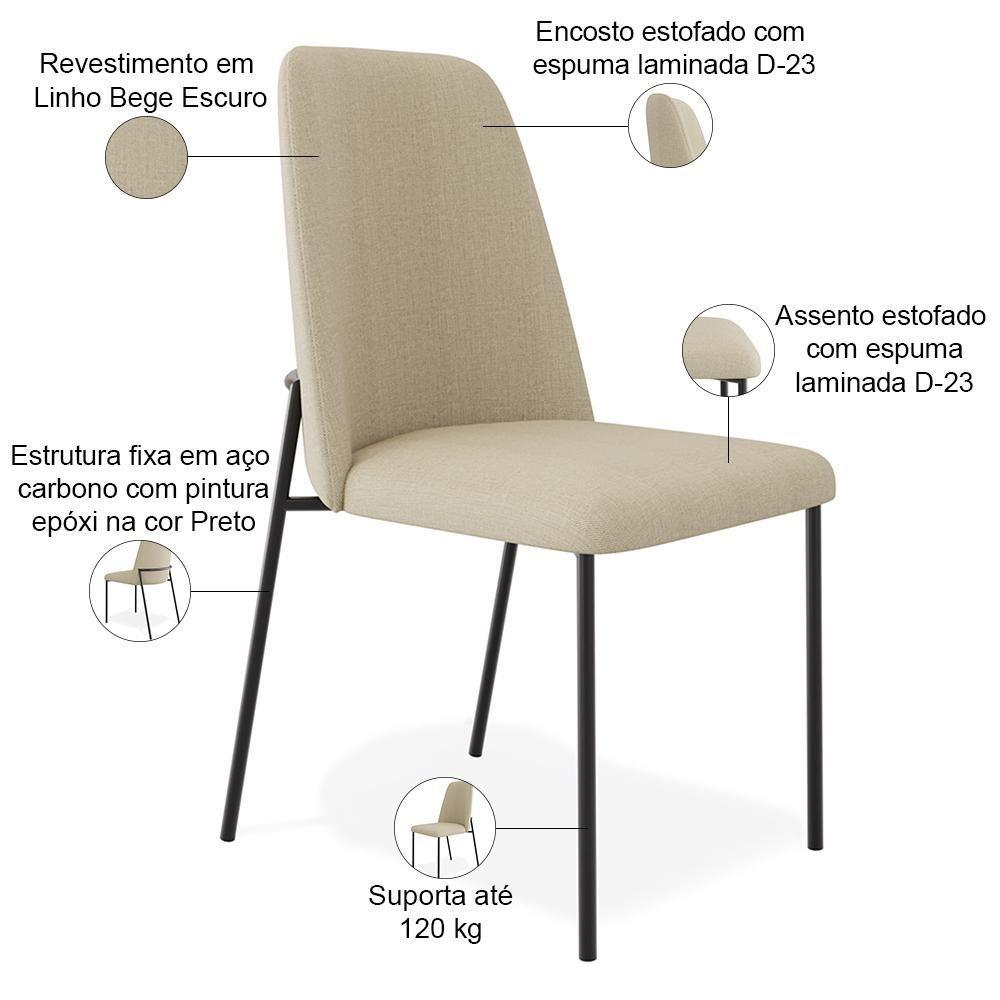 Kit 06 Cadeiras Decorativa Estofada Para Sala De Jantar Bella L02 Linho Bege Escuro - Lyam DecorO Kit 06 Cadeiras Bella é o equilíbrio perfeito entre estilo sofisticado, conforto e funcionalidade. Projetada para se destacar em qualquer ambiente, seja na sala de jantar, recepção ou em ambiente comercial, esta peça é ideal para quem quer investir em conforto e beleza. Produzida com materiais de alta qualidade e acabamento impecável, seu visual contemporâneo e detalhes cuidadosamente elaborados, a cadeira Bella transforma qualquer espaço, trazendo charme e praticidade ao dia a dia. Adquira já a sua!!Dimensões da Poltrona (L x A x P) 47 x 89 x 52 cmMedidas Internas: Altura do chão ao assento: 48 cmCaracterísticas: Estrutura fixa em aço carbono com pintura epóxi na cor Preto. Revestimento em Linho na cor Bege Escuro. Encosto e assento estofados com espuma D-23. Suporta até 120 kg.- Por se tratar de estofado as medidas podem ter uma pequena variação de até 3 cm. - A tonalidade do produto real poderá ter ligeira variação devido o lote de tecidos. - Indicado para uso residencial, sua limpeza deve ser feita com pano levemente umedecido em água limpa, sem esfregar, não utilizar produtos abrasivos, desengordurantes, álcool ou solvente.Observações importantes: - Produto para uso residencial em ambiente interno, não devendo ficar exposto diretamente ao sol, calor e umidade excessivos. - Pode haver alguma diferença de tonalidade entre a imagem e o produto real, por conta do tratamento de imagens e a calibração de cores do seu monitor. - As imagens são meramente ilustrativas, não acompanham objetos de decoração e eletrônicos. - Ao receber a mercadoria, o cliente deve verificar as condições da embalagem, caso haja alguma avaria não assine o comprovante de recebimento e entre em contato com nossa loja para orientações. - Montagem, desmontagem e outras instalações serão de responsabilidade do cliente. Não nos responsabilizamos, no ato da entrega, por subir escadas/elevadores ou pelo transporte por guincho em apartamentos. Eventuais despesas são de responsabilidade do comprador. - Confira as dimensões do produto e certifique-se de que passará normalmente por supostos elevadores, portas, escadas e/ou corredores de sua residência. NA