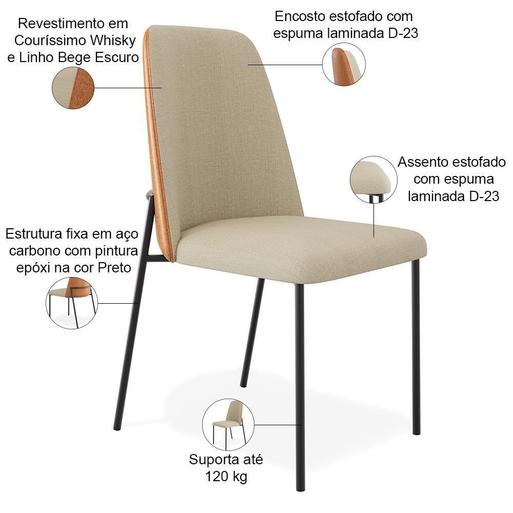 Kit 08 Cadeiras Decorativa Estofada Sala De Jantar Bella L02 Couríssimo Whisky Linho Bege - Lyam DecorO Kit 08 Cadeiras Bella é o equilíbrio perfeito entre estilo sofisticado, conforto e funcionalidade. Projetada para se destacar em qualquer ambiente, seja na sala de jantar, recepção ou em ambiente comercial, esta peça é ideal para quem quer investir em conforto e beleza. Produzida com materiais de alta qualidade e acabamento impecável, seu visual contemporâneo e detalhes cuidadosamente elaborados, a cadeira Bella transforma qualquer espaço, trazendo charme e praticidade ao dia a dia. Adquira já a sua!!Dimensões da Poltrona (L x A x P) 47 x 89 x 52 cmMedidas Internas: Altura do chão ao assento: 48 cmCaracterísticas: Estrutura fixa em aço carbono com pintura epóxi na cor Preto. Revestimento em Couríssimo na cor Whisky e Linho na cor Bege. Encosto e assento estofados com espuma D-23. Suporta até 120 kg.- Por se tratar de estofado as medidas podem ter uma pequena variação de até 3 cm. - A tonalidade do produto real poderá ter ligeira variação devido o lote de tecidos. - Indicado para uso residencial, sua limpeza deve ser feita com pano levemente umedecido em água limpa, sem esfregar, não utilizar produtos abrasivos, desengordurantes, álcool ou solvente.Observações importantes: - Produto para uso residencial em ambiente interno, não devendo ficar exposto diretamente ao sol, calor e umidade excessivos. - Pode haver alguma diferença de tonalidade entre a imagem e o produto real, por conta do tratamento de imagens e a calibração de cores do seu monitor. - As imagens são meramente ilustrativas, não acompanham objetos de decoração e eletrônicos. - Ao receber a mercadoria, o cliente deve verificar as condições da embalagem, caso haja alguma avaria não assine o comprovante de recebimento e entre em contato com nossa loja para orientações. - Montagem, desmontagem e outras instalações serão de responsabilidade do cliente. Não nos responsabilizamos, no ato da entrega, por subir escadas/elevadores ou pelo transporte por guincho em apartamentos. Eventuais despesas são de responsabilidade do comprador. - Confira as dimensões do produto e certifique-se de que passará normalmente por supostos elevadores, portas, escadas e/ou corredores de sua residência. NA