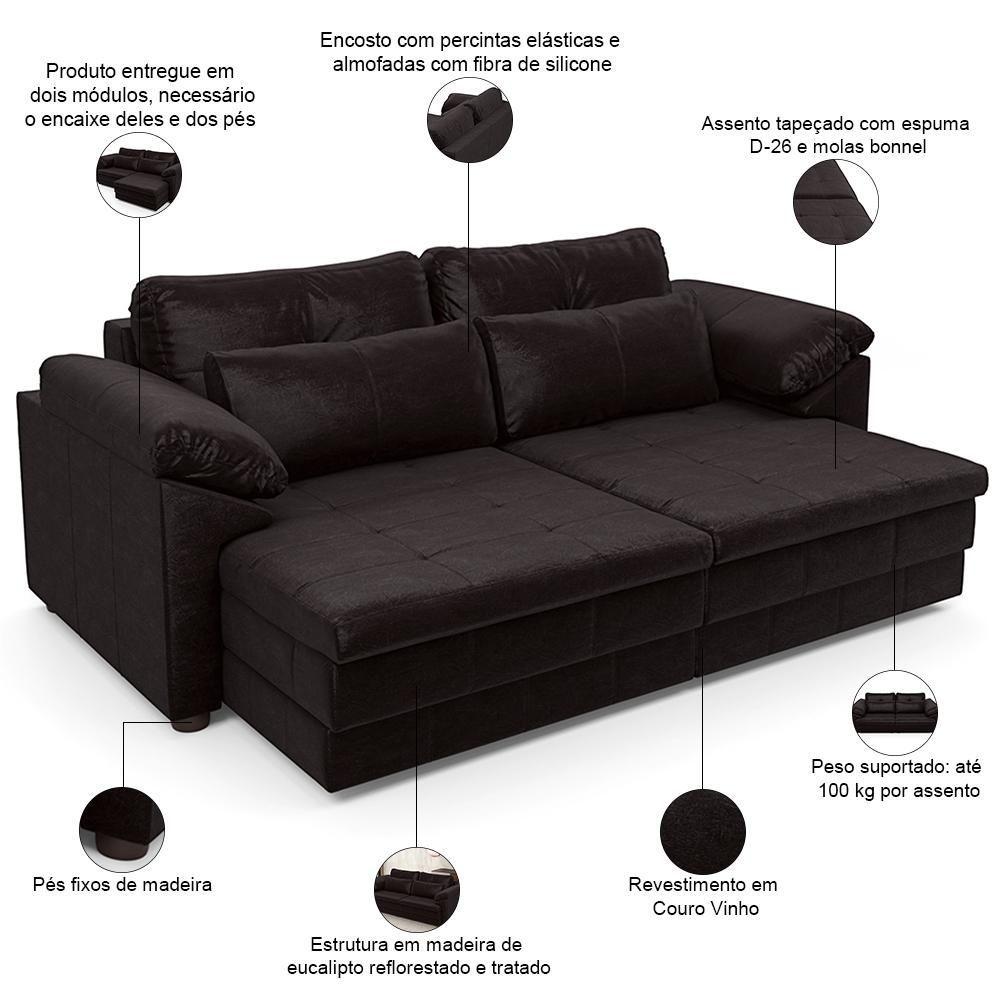 Sofá Retrátil Para Sala De Estar 2 Lugares 175cm Riza S03 Couro Vinho - Lyam DecorA Sala de Estar combina com conforto, não é mesmo? Afinal, poder desfrutar de uns momentos de descanso nesse cômodo é uma sensação sem igual. Melhor ainda se for em um estofado lindo e aconchegante! E é isso que você pode conseguir com o Sofá Retrátil Para Sala 2 Lugares 175cm Riza !Este lindo modelo de sofá de couro conta com estrutura em madeira de eucalipto tratado e reflorestado, garantindo uma base forte e resistente. O encosto possui percintas elásticas, também apresenta almofadas com fibra de silicone, assento com espumas e molas bonnel. Com design moderno e elegante, ele combina o que há de melhor na estrutura e elegância com revestimento em couro e a praticidade que só um sofá retrátil consegue oferecer. Com essas características, esse estofado pode transformar sua sala de estar ou sala de TV! Aproveite e garanta o seu! Dimensões do Sofá (L x A x P): 175 x 90 x 120 cm. Medidas Internas: Largura do braço: 25 cm. Largura livre por assento: 62,5 cm. Profundidade do assento aberto: 160 cm. Profundidade do assento fechado: 120 cm. Características: Estrutura em madeira de eucalipto reflorestado e tratado. Assento tapeçado com espuma D-26 e molas bonnel, encosto com percintas elásticas e almofadas com fibra de silicone. Revestimento em Couro de alta qualidade na tonalidade Vinho. Necessita encaixe dos pés e dos módulos. Pés fixos de madeira. Suporta até 100 kg por assento. Produto entregue em dois módulos. - Por se tratar de estofado as medidas podem ter uma pequena variação de até 3 cm. - A tonalidade do produto real poderá ter ligeira variação devido o lote de tecidos. - A limpeza deve ser feita com pano levemente umedecido em água limpa, sem esfregar, não utilizar produtos abrasivos, desengordurantes, álcool ou solvente. Observações importantes: - Produto para uso residencial em ambiente interno, não devendo ficar exposto diretamente ao sol, calor e umidade excessivos. - Pode haver alguma diferença de tonalidade entre a imagem e o produto real, por conta do tratamento de imagens e a calibração de cores do seu monitor. - As imagens são meramente ilustrativas, não acompanham objetos de decoração e eletrônicos. - Ao receber a mercadoria, o cliente deve verificar as condições da embalagem, caso haja alguma avaria não assine o comprovante de recebimento. - Montagem, desmontagem e outras instalações serão de responsabilidade do cliente. Não nos responsabilizamos, no ato da entrega, por subir escadas/elevadores ou pelo transporte por guincho em apartamentos. Eventuais despesas são de responsabilidade do comprador. - Confira as dimensões do produto e certifique-se de que passará normalmente por supostos elevadores, portas, escadas e/ou corredores de sua residência. ColorSimple: Vinho | Largura: 175 cm | ColorSupplier: Vinho | Profundidade: 120 cm | Cor: Vinho | Estilo: Moderno | MaterialFamily: Eucalipto, Espuma | OriginState: PR | Fabricante: Lyam Decor | Color: Vinho | OriginCountry: Brasil | Altura: 90 cm | ColorFamily: Vinho | ProductContents: 01 Sofá | Material: Madeira de Eucalipto, Espuma D-26 | SupplierSimpleName: Sofá Retrátil Para Sala de Estar 2 Lugares 175cm Riza S03 Couro Vinho - Lyam Decor | ProductLength: 120 cm