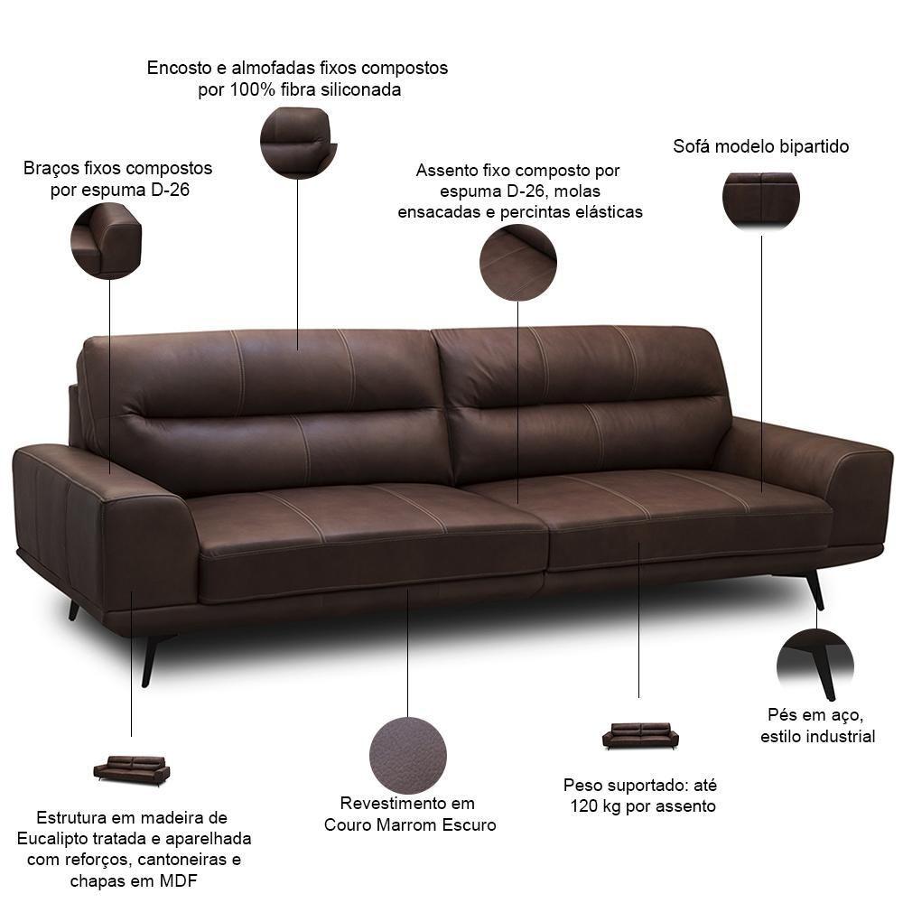 Sofá 3 Lugares Para Sala Living Industrial 236cm Cádis L06 Couro Marrom Escuro - Lyam Decor