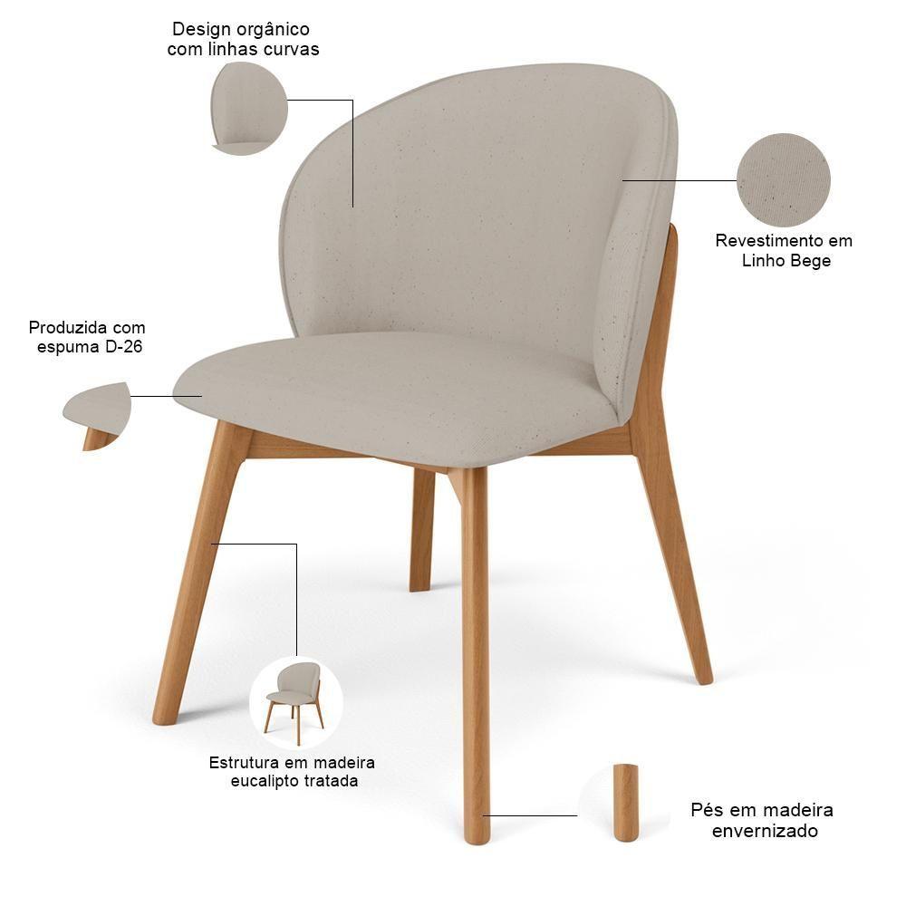Kit 03 Cadeiras De Jantar E Estar Living Estofada Mia L02 Linho Bege - Lyam Decor O Kit 03 Cadeiras de Jantar e Estar Living Estofada Mia, da Lyam Decor, é a combinação perfeita de design orgânico, conforto e modernidade, expressos em cada detalhe, desde as linhas curvas do assento e encosto até os pés de madeira maciça envernizada. Em outras palavras, essa cadeira estofada é ideal para complementar sua sala de jantar ou estar com elegância e estilo. Além disso, a tapeçaria feita com espuma D-26 oferece um conforto excepcional, permitindo que você desfrute de momentos prazerosos durante suas refeições ou conversas com amigos e familiares. Para completar, essa cadeira de jantar moderna é perfeita para quem busca uma sala de jantar contemporânea, já que seu design único traz uma sensação de beleza e sofisticação ao ambiente e, ainda, harmoniza facilmente com diversos estilos de mesa de jantar. Ah, mas além da sala de jantar, você também pode aproveitá-la como assento extra na sala de estar, recepção, escritório e até mesmo no quarto, ou seja, uma cadeira de madeira versátil como você sempre quis. Então, que tal garantir bem-estar e beleza em um único produto? Adquira agora a Cadeira Mia e transforme seu ambiente em um espaço acolhedor, elegante e cheio de personalidade.Dimensões do produto (L x A x P) 56 cm x 81 cm x 54 cmMedidas internas Altura do assento ao chão: 47 cm Profundidade do assento: 43 cm Altura do encosto: 38 cm Peso aproximado: 8 kgCaracterísticas: Estrutura de Madeira de Eucalipto tratado de reserva legalizada, correto ecologicamente. Revestimento em Linho na cor Bege. Assento e encosto com espuma D-26. Peso máximo suportado por cadeira até 150 kg. Pés em madeira envernizados. Design orgânico, com linhas curvas. Produto entregue montado.- Por se tratar de estofado as medidas podem ter uma pequena variação de até 3 cm. - A tonalidade do produto real poderá ter ligeira variação devido o lote de tecidos. - A limpeza deve ser feita com pano levemente umedecido em água limpa, sem esfregar, não utilizar produtos abrasivos, desengordurantes, álcool ou solvente.Observações importantes: - Produto para uso residencial em ambiente interno, não devendo ficar exposto diretamente ao sol, calor e umidade excessivos. - Pode haver alguma diferença de tonalidade entre a imagem e o produto real, por conta do tratamento de imagens e a calibração de cores do seu monitor. - As imagens são meramente ilustrativas, não acompanham objetos de decoração e eletrônicos. - Ao receber a mercadoria, o cliente deve verificar as condições da embalagem, caso haja alguma não assine o de . - Montagem, desmontagem e outras instalações serão de responsabilidade do cliente. Não nos responsabilizamos, no ato da , por subir escadas/elevadores ou pelo por guincho em apartamentos. Eventuais despesas são de responsabilidade do comprador. - Confira as dimensões do produto e certifique-se de que passará normalmente por supostos elevadores, portas, escadas e/ou corredores de sua residência. ColorSimple: Bege | ColorSupplier: Bege | ProductHeight: 81 cm | OriginState: PR | MaterialFamily: Madeira, linho e espuma | Color: Bege | ProductWarranty: 90 dias após o do produto | Model: Mia | SizeDescription: Altura: 81 cm x Largura: 56 cm x Profundidade: 54 cm | ColorFamily: Bege | ProductContents: 03 Cadeiras | ProductInstructions: Produto para uso em ambiente interno, nao devendo ficar exposto ao sol, calor e umidade excessivos. | ProductWeight: 21 kg | OriginCountry: | ProductLength: 54 cm | Material: Estrutura em Madeira, Revestimento em Linho e espuma | SupplierSimpleName: Kit 03 Cadeiras de Jantar e Estar Living Estofada Mia L02 Linho Bege - Lyam Decor | ProductWidth: 56 cm