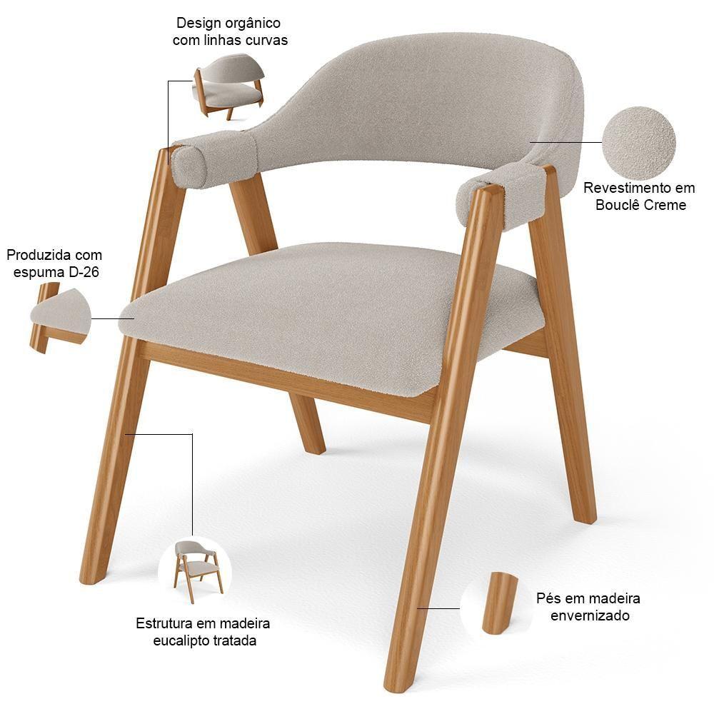 Kit 05 Cadeiras De Jantar E Estar Living Estofada Nadja L02 Bouclê Creme - Lyam Decor O Kit 05 Cadeiras de Jantar e Estar Living Estofada Nadja, das Lyam Decor, é a escolha perfeita para criar uma sala de jantar moderna e acolhedora. Com seu design curvo e pés de madeira maciça envernizada, essa cadeira estofada traz elegância e sofisticação ao ambiente. Além disso, é tapeçada com espuma d-26, o que proporciona um conforto excepcional, permitindo que você desfrute de momentos incríveis à mesa. Já o design orgânico combina beleza e modernidade, tornando-a uma peça única, enquanto os braços adicionam um toque extra de conforto e estilo. A Cadeira Nadja é o equilíbrio perfeito entre funcionalidade e design, uma vez que pode facilmente ser utilizada em diversos ambientes, como espaços comerciais, recepção de hotel e eventos, até como poltrona para sala de estar. Adicione esse elemento indispensável à sua decoração e transforme qualquer ambiente em um lugar especial. Não perca a oportunidade de adquirir essa cadeira de jantar que vai encantar a todos.Dimensões do produto (L x A x P) 59,5 cm x 81 cm x 70 cmMedidas internas Altura do assento ao chão: 47 cm Largura do assento: 53,5 cm Profundidade do assento: 47 cm Altura do encosto: 37 cm Altura das braças: 22 cm Peso aproximado: 8 kgCaracterísticas: Estrutura de Madeira de Eucalipto tratado de reserva legalizada, correto ecologicamente. Revestimento em Bouclê na cor Creme. Assento e encosto com espuma D-26. Peso máximo suportado por cadeira até 150 kg. Pés em madeira envernizados. Design orgânico, com linhas curvas. Produto entregue montado.- Por se tratar de estofado as medidas podem ter uma pequena variação de até 3 cm. - A tonalidade do produto real poderá ter ligeira variação devido o lote de tecidos. - A limpeza deve ser feita com pano levemente umedecido em água limpa, sem esfregar, não utilizar produtos abrasivos, desengordurantes, álcool ou solvente.Observações importantes: - Produto para uso residencial em ambiente interno, não devendo ficar exposto diretamente ao sol, calor e umidade excessivos. - Pode haver alguma diferença de tonalidade entre a imagem e o produto real, por conta do tratamento de imagens e a calibração de cores do seu monitor. - As imagens são meramente ilustrativas, não acompanham objetos de decoração e eletrônicos. - Ao receber a mercadoria, o cliente deve verificar as condições da embalagem, caso haja alguma avaria não assine o comprovante de recebimento. - Montagem, desmontagem e outras instalações serão de responsabilidade do cliente. Não nos responsabilizamos, no ato da entrega, por subir escadas/elevadores ou pelo transporte por guincho em apartamentos. Eventuais despesas são de responsabilidade do comprador. - Confira as dimensões do produto e certifique-se de que passará normalmente por supostos elevadores, portas, escadas e/ou corredores de sua residência. NA