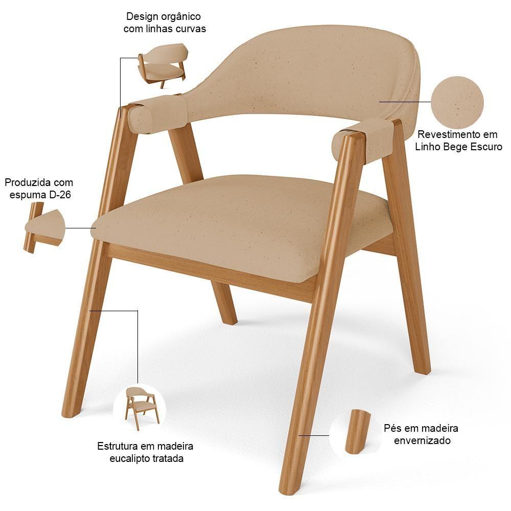 Kit 05 Cadeiras De Jantar E Estar Living Estofada Nadja L02 Linho Bege Escuro - Lyam Decor O Kit 05 Cadeiras de Jantar e Estar Living Estofada Nadja, das Lyam Decor, é a escolha perfeita para criar uma sala de jantar moderna e acolhedora. Com seu design curvo e pés de madeira maciça envernizada, essa cadeira estofada traz elegância e sofisticação ao ambiente. Além disso, é tapeçada com espuma d-26, o que proporciona um conforto excepcional, permitindo que você desfrute de momentos incríveis à mesa. Já o design orgânico combina beleza e modernidade, tornando-a uma peça única, enquanto os braços adicionam um toque extra de conforto e estilo. A Cadeira Nadja é o equilíbrio perfeito entre funcionalidade e design, uma vez que pode facilmente ser utilizada em diversos ambientes, como espaços comerciais, recepção de hotel e eventos, até como poltrona para sala de estar. Adicione esse elemento indispensável à sua decoração e transforme qualquer ambiente em um lugar especial. Não perca a oportunidade de adquirir essa cadeira de jantar que vai encantar a todos.Dimensões do produto (L x A x P) 59,5 cm x 81 cm x 70 cmMedidas internas Altura do assento ao chão: 47 cm Largura do assento: 53,5 cm Profundidade do assento: 47 cm Altura do encosto: 37 cm Altura das braças: 22 cm Peso aproximado: 8 kgCaracterísticas: Estrutura de Madeira de Eucalipto tratado de reserva legalizada, correto ecologicamente. Revestimento em Linho na cor Bege Escuro. Assento e encosto com espuma D-26. Peso máximo suportado por cadeira até 150 kg. Pés em madeira envernizados. Design orgânico, com linhas curvas. Produto entregue montado.- Por se tratar de estofado as medidas podem ter uma pequena variação de até 3 cm. - A tonalidade do produto real poderá ter ligeira variação devido o lote de tecidos. - A limpeza deve ser feita com pano levemente umedecido em água limpa, sem esfregar, não utilizar produtos abrasivos, desengordurantes, álcool ou solvente.Observações importantes: - Produto para uso residencial em ambiente interno, não devendo ficar exposto diretamente ao sol, calor e umidade excessivos. - Pode haver alguma diferença de tonalidade entre a imagem e o produto real, por conta do tratamento de imagens e a calibração de cores do seu monitor. - As imagens são meramente ilustrativas, não acompanham objetos de decoração e eletrônicos. - Ao receber a mercadoria, o cliente deve verificar as condições da embalagem, caso haja alguma avaria não assine o comprovante de recebimento. - Montagem, desmontagem e outras instalações serão de responsabilidade do cliente. Não nos responsabilizamos, no ato da entrega, por subir escadas/elevadores ou pelo transporte por guincho em apartamentos. Eventuais despesas são de responsabilidade do comprador. - Confira as dimensões do produto e certifique-se de que passará normalmente por supostos elevadores, portas, escadas e/ou corredores de sua residência. NA