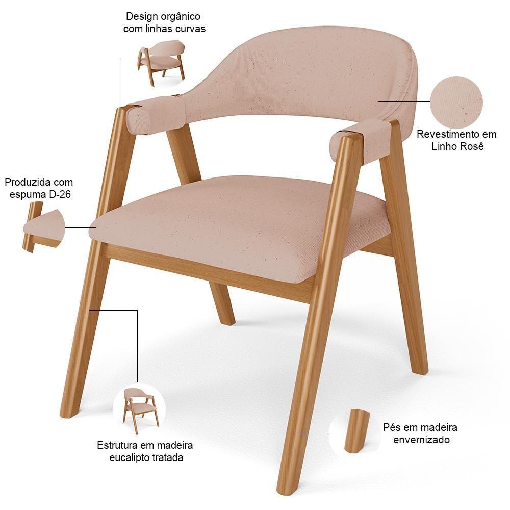 Kit 05 Cadeiras De Jantar E Estar Living Estofada Nadja L02 Linho Rosê - Lyam Decor O Kit 05 Cadeiras de Jantar e Estar Living Estofada Nadja, das Lyam Decor, é a escolha perfeita para criar uma sala de jantar moderna e acolhedora. Com seu design curvo e pés de madeira maciça envernizada, essa cadeira estofada traz elegância e sofisticação ao ambiente. Além disso, é tapeçada com espuma d-26, o que proporciona um conforto excepcional, permitindo que você desfrute de momentos incríveis à mesa. Já o design orgânico combina beleza e modernidade, tornando-a uma peça única, enquanto os braços adicionam um toque extra de conforto e estilo. A Cadeira Nadja é o equilíbrio perfeito entre funcionalidade e design, uma vez que pode facilmente ser utilizada em diversos ambientes, como espaços comerciais, recepção de hotel e eventos, até como poltrona para sala de estar. Adicione esse elemento indispensável à sua decoração e transforme qualquer ambiente em um lugar especial. Não perca a oportunidade de adquirir essa cadeira de jantar que vai encantar a todos.Dimensões do produto (L x A x P) 59,5 cm x 81 cm x 70 cmMedidas internas Altura do assento ao chão: 47 cm Largura do assento: 53,5 cm Profundidade do assento: 47 cm Altura do encosto: 37 cm Altura das braças: 22 cm Peso aproximado: 8 kgCaracterísticas: Estrutura de Madeira de Eucalipto tratado de reserva legalizada, correto ecologicamente. Revestimento em Linho na cor Rosê. Assento e encosto com espuma D-26. Peso máximo suportado por cadeira até 150 kg. Pés em madeira envernizados. Design orgânico, com linhas curvas. Produto entregue montado.- Por se tratar de estofado as medidas podem ter uma pequena variação de até 3 cm. - A tonalidade do produto real poderá ter ligeira variação devido o lote de tecidos. - A limpeza deve ser feita com pano levemente umedecido em água limpa, sem esfregar, não utilizar produtos abrasivos, desengordurantes, álcool ou solvente.Observações importantes: - Produto para uso residencial em ambiente interno, não devendo ficar exposto diretamente ao sol, calor e umidade excessivos. - Pode haver alguma diferença de tonalidade entre a imagem e o produto real, por conta do tratamento de imagens e a calibração de cores do seu monitor. - As imagens são meramente ilustrativas, não acompanham objetos de decoração e eletrônicos. - Ao receber a mercadoria, o cliente deve verificar as condições da embalagem, caso haja alguma avaria não assine o comprovante de recebimento. - Montagem, desmontagem e outras instalações serão de responsabilidade do cliente. Não nos responsabilizamos, no ato da entrega, por subir escadas/elevadores ou pelo transporte por guincho em apartamentos. Eventuais despesas são de responsabilidade do comprador. - Confira as dimensões do produto e certifique-se de que passará normalmente por supostos elevadores, portas, escadas e/ou corredores de sua residência. NA