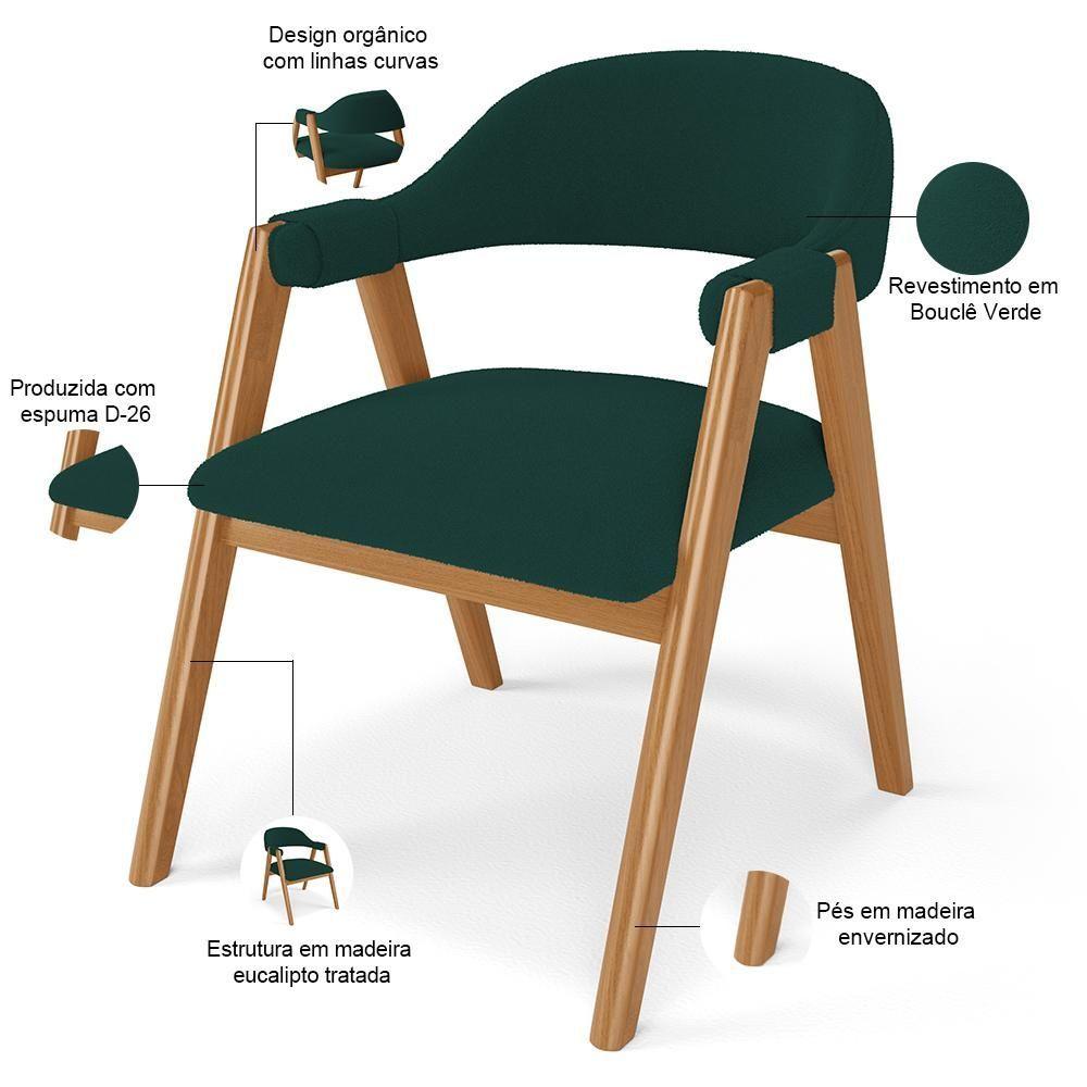 Kit 06 Cadeiras De Jantar E Estar Living Estofada Nadja L02 Bouclê Verde - Lyam Decor O Kit 06 Cadeiras de Jantar e Estar Living Estofada Nadja, das Lyam Decor, é a escolha perfeita para criar uma sala de jantar moderna e acolhedora. Com seu design curvo e pés de madeira maciça envernizada, essa cadeira estofada traz elegância e sofisticação ao ambiente. Além disso, é tapeçada com espuma d-26, o que proporciona um conforto excepcional, permitindo que você desfrute de momentos incríveis à mesa. Já o design orgânico combina beleza e modernidade, tornando-a uma peça única, enquanto os braços adicionam um toque extra de conforto e estilo. A Cadeira Nadja é o equilíbrio perfeito entre funcionalidade e design, uma vez que pode facilmente ser utilizada em diversos ambientes, como espaços comerciais, recepção de hotel e eventos, até como poltrona para sala de estar. Adicione esse elemento indispensável à sua decoração e transforme qualquer ambiente em um lugar especial. Não perca a oportunidade de adquirir essa cadeira de jantar que vai encantar a todos.Dimensões do produto (L x A x P) 59,5 cm x 81 cm x 70 cmMedidas internas Altura do assento ao chão: 47 cm Largura do assento: 53,5 cm Profundidade do assento: 47 cm Altura do encosto: 37 cm Altura das braças: 22 cm Peso aproximado: 8 kgCaracterísticas: Estrutura de Madeira de Eucalipto tratado de reserva legalizada, correto ecologicamente. Revestimento em Bouclê na cor Verde Assento e encosto com espuma D-26. Peso máximo suportado por cadeira até 150 kg. Pés em madeira envernizados. Design orgânico, com linhas curvas. Produto entregue montado.- Por se tratar de estofado as medidas podem ter uma pequena variação de até 3 cm. - A tonalidade do produto real poderá ter ligeira variação devido o lote de tecidos. - A limpeza deve ser feita com pano levemente umedecido em água limpa, sem esfregar, não utilizar produtos abrasivos, desengordurantes, álcool ou solvente.Observações importantes: - Produto para uso residencial em ambiente interno, não devendo ficar exposto diretamente ao sol, calor e umidade excessivos. - Pode haver alguma diferença de tonalidade entre a imagem e o produto real, por conta do tratamento de imagens e a calibração de cores do seu monitor. - As imagens são meramente ilustrativas, não acompanham objetos de decoração e eletrônicos. - Ao receber a mercadoria, o cliente deve verificar as condições da embalagem, caso haja alguma avaria não assine o comprovante de recebimento. - Montagem, desmontagem e outras instalações serão de responsabilidade do cliente. Não nos responsabilizamos, no ato da entrega, por subir escadas/elevadores ou pelo transporte por guincho em apartamentos. Eventuais despesas são de responsabilidade do comprador. - Confira as dimensões do produto e certifique-se de que passará normalmente por supostos elevadores, portas, escadas e/ou corredores de sua residência. NA