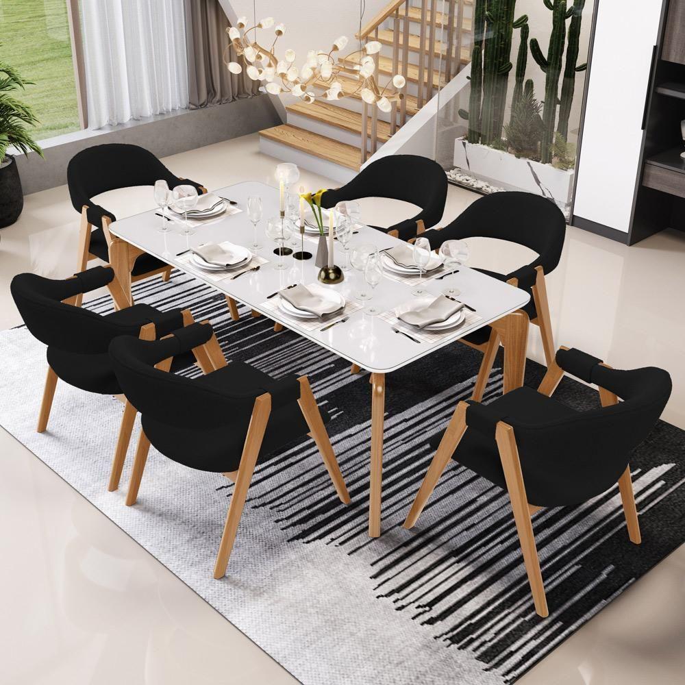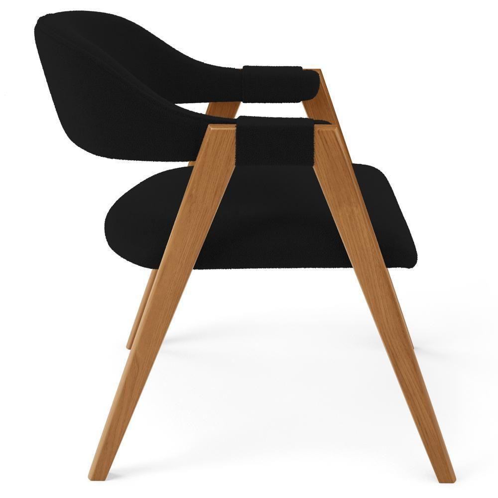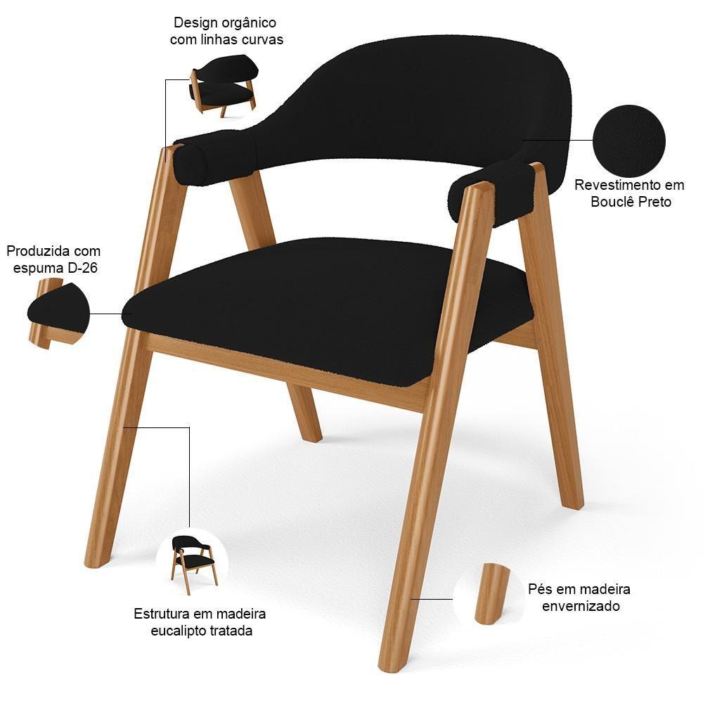 Kit 05 Cadeiras De Jantar E Estar Living Estofada Nadja L02 Bouclê Preto - Lyam Decor O Kit 05 Cadeiras de Jantar e Estar Living Estofada Nadja, das Lyam Decor, é a escolha perfeita para criar uma sala de jantar moderna e acolhedora. Com seu design curvo e pés de madeira maciça envernizada, essa cadeira estofada traz elegância e sofisticação ao ambiente. Além disso, é tapeçada com espuma d-26, o que proporciona um conforto excepcional, permitindo que você desfrute de momentos incríveis à mesa. Já o design orgânico combina beleza e modernidade, tornando-a uma peça única, enquanto os braços adicionam um toque extra de conforto e estilo. A Cadeira Nadja é o equilíbrio perfeito entre funcionalidade e design, uma vez que pode facilmente ser utilizada em diversos ambientes, como espaços comerciais, recepção de hotel e eventos, até como poltrona para sala de estar. Adicione esse elemento indispensável à sua decoração e transforme qualquer ambiente em um lugar especial. Não perca a oportunidade de adquirir essa cadeira de jantar que vai encantar a todos.Dimensões do produto (L x A x P) 59,5 cm x 81 cm x 70 cmMedidas internas Altura do assento ao chão: 47 cm Largura do assento: 53,5 cm Profundidade do assento: 47 cm Altura do encosto: 37 cm Altura das braças: 22 cm Peso aproximado: 8 kgCaracterísticas: Estrutura de Madeira de Eucalipto tratado de reserva legalizada, correto ecologicamente. Revestimento em Bouclê na cor Preto. Assento e encosto com espuma D-26. Peso máximo suportado por cadeira até 150 kg. Pés em madeira envernizados. Design orgânico, com linhas curvas. Produto entregue montado.- Por se tratar de estofado as medidas podem ter uma pequena variação de até 3 cm. - A tonalidade do produto real poderá ter ligeira variação devido o lote de tecidos. - A limpeza deve ser feita com pano levemente umedecido em água limpa, sem esfregar, não utilizar produtos abrasivos, desengordurantes, álcool ou solvente.Observações importantes: - Produto para uso residencial em ambiente interno, não devendo ficar exposto diretamente ao sol, calor e umidade excessivos. - Pode haver alguma diferença de tonalidade entre a imagem e o produto real, por conta do tratamento de imagens e a calibração de cores do seu monitor. - As imagens são meramente ilustrativas, não acompanham objetos de decoração e eletrônicos. - Ao receber a mercadoria, o cliente deve verificar as condições da embalagem, caso haja alguma avaria não assine o comprovante de recebimento. - Montagem, desmontagem e outras instalações serão de responsabilidade do cliente. Não nos responsabilizamos, no ato da entrega, por subir escadas/elevadores ou pelo transporte por guincho em apartamentos. Eventuais despesas são de responsabilidade do comprador. - Confira as dimensões do produto e certifique-se de que passará normalmente por supostos elevadores, portas, escadas e/ou corredores de sua residência. NA
