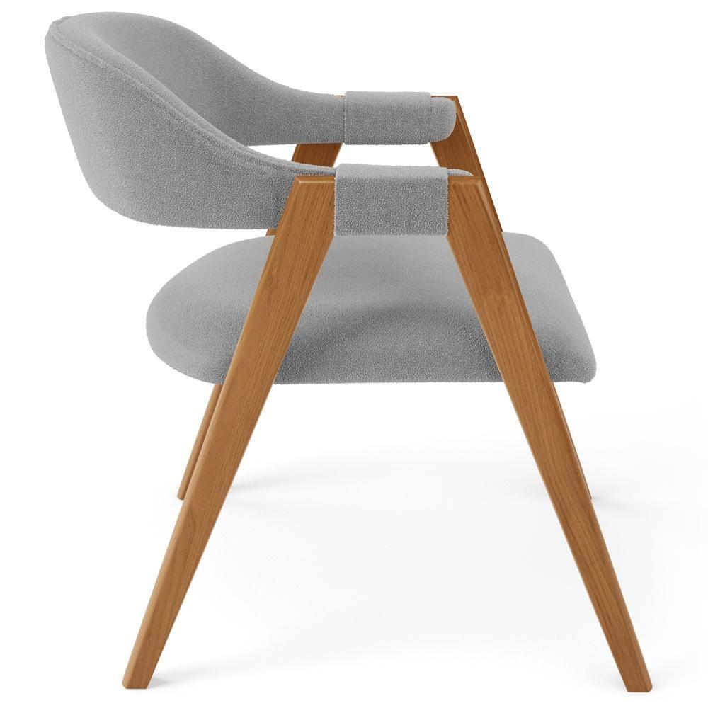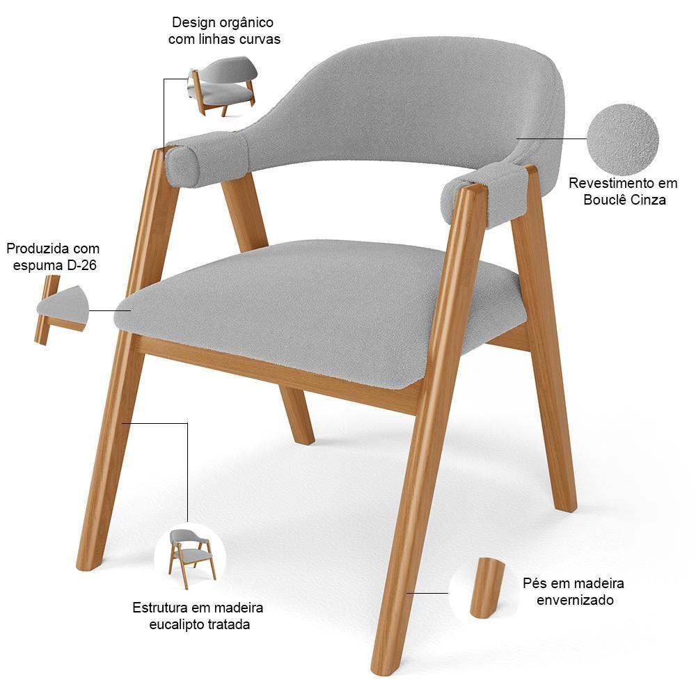 Kit 06 Cadeiras De Jantar E Estar Living Estofada Nadja L02 Bouclê Cinza - Lyam Decor O Kit 06 Cadeiras de Jantar e Estar Living Estofada Nadja, das Lyam Decor, é a escolha perfeita para criar uma sala de jantar moderna e acolhedora. Com seu design curvo e pés de madeira maciça envernizada, essa cadeira estofada traz elegância e sofisticação ao ambiente. Além disso, é tapeçada com espuma d-26, o que proporciona um conforto excepcional, permitindo que você desfrute de momentos incríveis à mesa. Já o design orgânico combina beleza e modernidade, tornando-a uma peça única, enquanto os braços adicionam um toque extra de conforto e estilo. A Cadeira Nadja é o equilíbrio perfeito entre funcionalidade e design, uma vez que pode facilmente ser utilizada em diversos ambientes, como espaços comerciais, recepção de hotel e eventos, até como poltrona para sala de estar. Adicione esse elemento indispensável à sua decoração e transforme qualquer ambiente em um lugar especial. Não perca a oportunidade de adquirir essa cadeira de jantar que vai encantar a todos.Dimensões do produto (L x A x P) 59,5 cm x 81 cm x 70 cmMedidas internas Altura do assento ao chão: 47 cm Largura do assento: 53,5 cm Profundidade do assento: 47 cm Altura do encosto: 37 cm Altura das braças: 22 cm Peso aproximado: 8 kgCaracterísticas: Estrutura de Madeira de Eucalipto tratado de reserva legalizada, correto ecologicamente. Revestimento em Bouclê na cor Cinza Assento e encosto com espuma D-26. Peso máximo suportado por cadeira até 150 kg. Pés em madeira envernizados. Design orgânico, com linhas curvas. Produto entregue montado.- Por se tratar de estofado as medidas podem ter uma pequena variação de até 3 cm. - A tonalidade do produto real poderá ter ligeira variação devido o lote de tecidos. - A limpeza deve ser feita com pano levemente umedecido em água limpa, sem esfregar, não utilizar produtos abrasivos, desengordurantes, álcool ou solvente.Observações importantes: - Produto para uso residencial em ambiente interno, não devendo ficar exposto diretamente ao sol, calor e umidade excessivos. - Pode haver alguma diferença de tonalidade entre a imagem e o produto real, por conta do tratamento de imagens e a calibração de cores do seu monitor. - As imagens são meramente ilustrativas, não acompanham objetos de decoração e eletrônicos. - Ao receber a mercadoria, o cliente deve verificar as condições da embalagem, caso haja alguma avaria não assine o comprovante de recebimento. - Montagem, desmontagem e outras instalações serão de responsabilidade do cliente. Não nos responsabilizamos, no ato da entrega, por subir escadas/elevadores ou pelo transporte por guincho em apartamentos. Eventuais despesas são de responsabilidade do comprador. - Confira as dimensões do produto e certifique-se de que passará normalmente por supostos elevadores, portas, escadas e/ou corredores de sua residência. NA