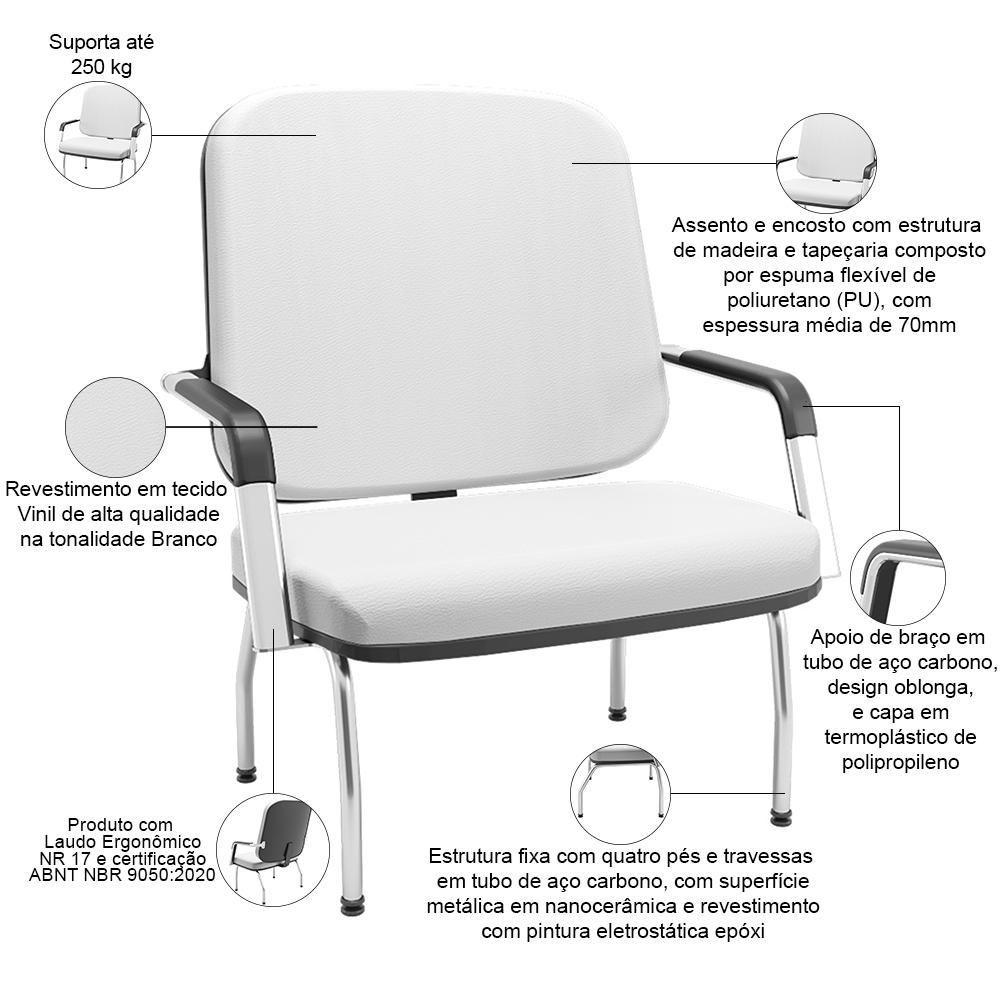 Cadeira De Escritório Recepção Com Braço Fixa Cromada Magno P03 Vinil Branco - Lyam DecorDescubra a Cadeira de Escritório Magno Pés Cromado, da Lyam Decor, a escolha perfeita para quem valoriza conforto e estilo sem abrir mão da robustez.Com um design pensado para o acomodar usuários com sobrepeso, essa cadeira plus size é ideal para escritórios, salas de espera e recepções, oferecendo um acolhimento excepcional. Além disso, é fabricada com uma estrutura de aço carbono resistente e um acabamento epóxi que garante durabilidade e resistência, combinando funcionalidade e elegância. Para completar, o assento amplo e confortável proporciona uma experiência de uso agradável, seja para longas horas de trabalho ou momentos de espera. Transforme seu espaço com a Cadeira Magno, onde cada detalhe foi pensado para garantir o máximo de conforto e acolhimento, criando um ambiente convidativo e profissional! Dimensões da Cadeira (L x A x P) 87 x 104 x 72,5 cm Medidas Internas: Encosto (l x A): 74,7 x 65,5 cm Assento (L x P): 76,8 x 50,8 cm Altura do chão ao assento: 44,2 cm Características: Estrutura fixa com quatro pés e travessas em tubo de aço carbono, com superfície metálica em nanocerâmica e revestimento com pintura eletrostática epóxi para maior proteção contra corrosão e durabilidade. Apoio de braço em tubo de aço carbono, design oblonga, com capa em termoplástico de polipropileno. Revestimento em tecido Vinil de alta qualidade na tonalidade Branco. Assento e encosto com estrutura de madeira e tapeçaria compostos por espuma flexível de poliuretano (PU), com espessura média de 70mm. Peso máximo suportado 250 kg. Produto com Laudo Ergonômico NR 17 e certificação ABNT NBR 9050:2020. - Por se tratar de estofado as medidas podem ter uma pequena variação de até 3 cm. - A tonalidade do produto real poderá ter ligeira variação devido o lote de tecidos. Observações importantes: - Produto para uso residencial em ambiente interno, não devendo ficar exposto diretamente ao sol, calor e umidade excessivos. - Pode haver alguma diferença de tonalidade entre a imagem e o produto real, por conta do tratamento de imagens e a calibração de cores do seu monitor. - As imagens são meramente ilustrativas, não acompanham objetos de decoração e eletrônicos. - Ao receber a mercadoria, o cliente deve verificar as condições da embalagem, caso haja alguma avaria não assine o comprovante de recebimento e entre em contato com nossa loja para orientações. - Montagem, desmontagem e outras instalações serão de responsabilidade do cliente. Não nos responsabilizamos, no ato da entrega, por subir escadas/elevadores ou pelo transporte por guincho em apartamentos. Eventuais despesas são de responsabilidade do comprador. - Confira as dimensões do produto e certifique-se de que passará normalmente por supostos elevadores, portas, escadas e/ou corredores de sua residência. Cor: Branco | Model: Magno | Tipo de cadeira de escritório: Cadeira Recepção, Sala de Espera | ColorSimple: Branco | ColorFamily: Branco | Color: Branco | Com apoio de braços: Sim | Requer montagem: Sim | Material do estofamento: Vinil | Modelo detalhado: Magno com Braço Base Cromada | Material: Tubo de Aço Carbono, Espuma Flexível Poliuretano, Vinil | OriginCountry: Brasil | ProductWarranty: 90 dias após o recebimento do produto | Modelo: Magno | Materiais do aro para pés: na | Formato de venda: Unitário | ProductContents: 01 Cadeira, manual de instruções | ProductLength: 72 cm | ProductInstructions: Produto para uso em ambiente interno, nao devendo ficar exposto ao sol, calor e umidade excessivos. | Com rodas: Não | ProductWidth: 87 cm | SupplierSimpleName: Cadeira de Escritório Recepção com Braço Fixa Cromada Magno P03 Vinil Branco - Lyam Decor | OriginState: PR | MaterialFamily: Vinil | ColorSupplier: Branco | SizeDescription: Altura: 104 cm x Largura: 87 cm x Profundidade: 72 cm | Número de registrocertificação INMETRO: ABNT NBR 13962, NR 17 | Com aro para pés: Não | ProductHeight: 104 cm | ProductWeight: 17 kg