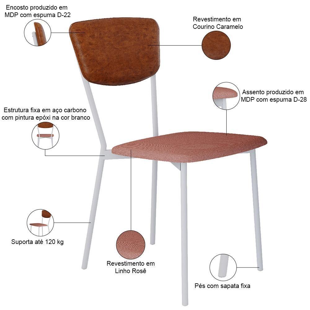 Kit 08 Cadeira Para Sala De Jantar Village Branco C01 Linho Rosê Courino Caramelo - Lyam DecorDesfrute de momentos inesquecíveis com o Kit 08 Cadeiras Village, projetada para oferecer o máximo de conforto e elegância com seu estilo retrô. Com sua estrutura de aço na tonalidade branco e assento e encosto estofados com materiais de altíssima qualidade, ela proporciona suporte ideal para longas refeições e conversas agradáveis. Além de combinar durabilidade e estilo, ela é a escolha perfeita para quem busca sofisticação e bem-estar em cada detalhe. Transforme sua sala de jantar com a nossa Cadeira Village. Aproveite!Dimensões da Cadeira (L x A x P) 43 x 83 x 53 cmAltura do chão ao assento: 49 cm Largura do encosto: 42 cm Altura do encosto: 23 cmCaracterísticas: Estrutura fixa em aço carbono com pintura epóxi na cor branco. Encosto produzido em MDP com espuma D-22. Assento produzido em MDP com espuma D-28. Revestimento em Linho Rosê e Courino na cor Caramelo. Pés com sapatas fixa. Peso suportado de até 120 kg.- Por se tratar de estofado as medidas podem ter uma pequena variação de até 3 cm. - A tonalidade do produto real poderá ter ligeira variação devido o lote de tecidos. - A limpeza deve ser feita com pano levemente umedecido em água limpa, sem esfregar, não utilizar produtos abrasivos, desengordurantes, álcool ou solvente.Observações importantes: - Produto para uso residencial em ambiente interno, não devendo ficar exposto diretamente ao sol, calor e umidade excessivos. - Pode haver alguma diferença de tonalidade entre a imagem e o produto real, por conta do tratamento de imagens e a calibração de cores do seu monitor. - As imagens são meramente ilustrativas, não acompanham objetos de decoração e eletrônicos. - Ao receber a mercadoria, o cliente deve verificar as condições da embalagem, caso haja alguma avaria não assine o comprovante de recebimento. - Montagem, desmontagem e outras instalações serão de responsabilidade do cliente. Não nos responsabilizamos, no ato da entrega, por subir escadas/elevadores ou pelo transporte por guincho em apartamentos. Eventuais despesas são de responsabilidade do comprador. - Confira as dimensões do produto e certifique-se de que passará normalmente por supostos elevadores, portas, escadas e/ou corredores de sua residência. SizeDescription: Altura: 249 cm x Largura: 43 cm x Profundidade: 53 cm | OriginCountry: Brasil | ProductWarranty: 90 dias após o recebimento do produto | ColorSimple: Caramelo | ProductWidth: 43 cm | OriginState: PR | ColorFamily: Caramelo | SupplierSimpleName: Kit 08 Cadeira Para Sala de Jantar Village Branco C01 Linho Rosê Courino Caramelo - Lyam Decor | ProductInstructions: Produto para uso em ambiente interno, nao devendo ficar exposto ao sol, calor e umidade excessivos. | MaterialFamily: Aço, MDP, Linho, Couro sintético e espuma | Color: Caramelo | Model: Village | ColorSupplier: Caramelo | ProductContents: 08 Cadeiras | Material: Estrutura em Aço e MDP, Revestimento em Linho, couro sintético e espuma | ProductWeight: 52 kg | ProductLength: 53 cm | ProductHeight: 249 cm | Cor: Rosa