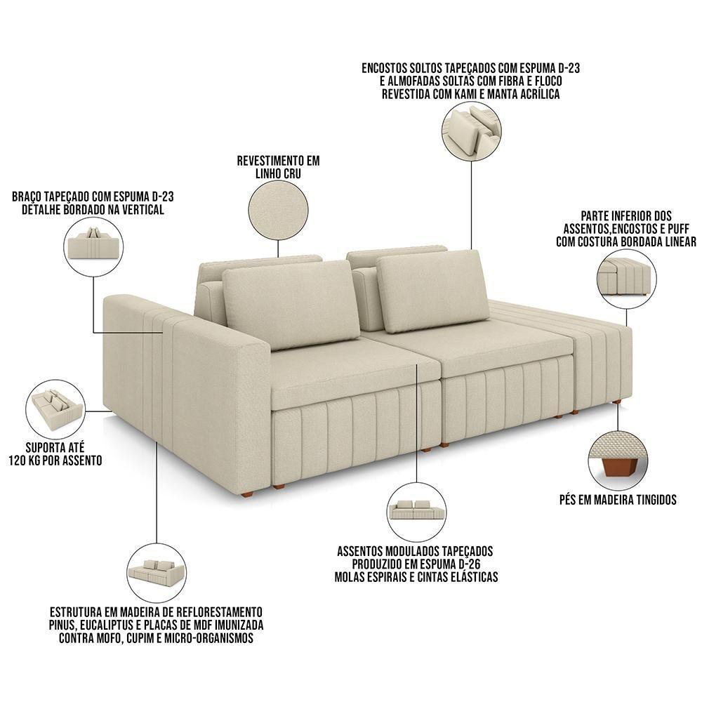 Sofá Ilha Com Puff Para Sala Living 265cm Amber M03 Linho Cru - Lyam Decor