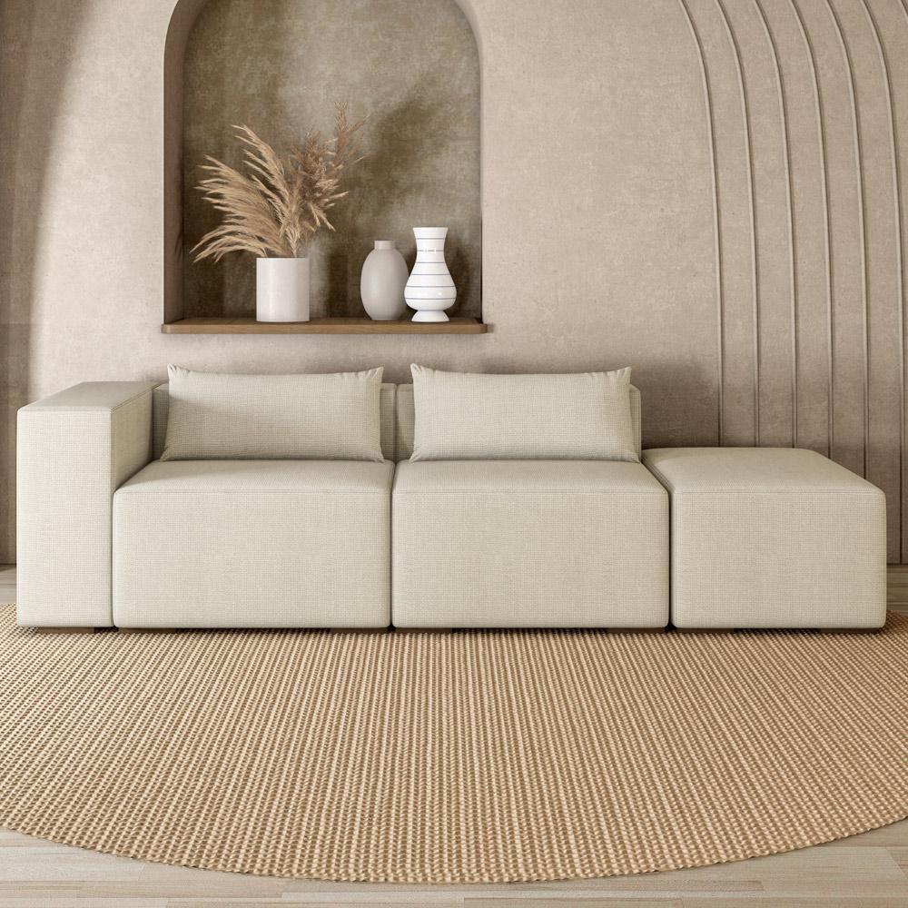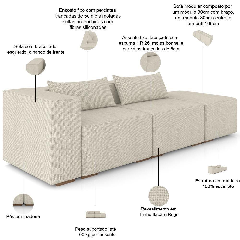 Sofá 3 Lugares Com Puff Para Sala Living 298cm Austin P08 Linho Itacaré Bege - Lyam Decor
