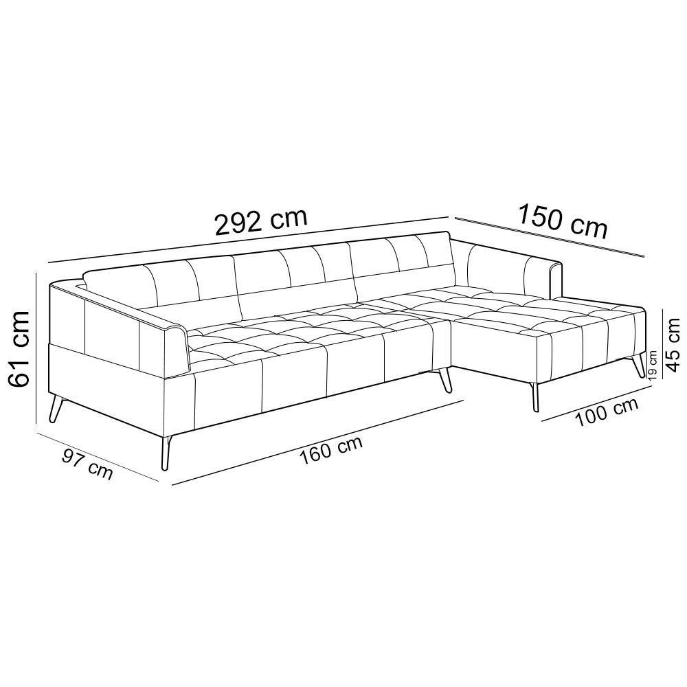 Sofá 3 Lugares Com Chaise Para Sala Living 292cm Tolstoi P08 Couro Bege - Lyam DecorO Sofá 3 Lugares Tolstoi 292cm, da Lyam Decor é a declaração definitiva de estilo e funcionalidade. Com seu design moderno e pés metálicos de inspiração industrial, ele traz um ar urbano e sofisticado para sua sala de estar ou living, sem abrir mão do conforto mais luxuoso.Esse sofá com chaise integrada é um convite irrecusável ao relaxamento - perfeito para esticar as pernas após um longo dia ou acomodar visitas com elegância. Os assentos e encostos generosos, combinados com materiais premium, garantam um apoio suave e duradouro, enquanto a estrutura reforçada assegura resistência sem igual. Além disso, por ser um sofá de couro a durabilidade e fácil manutenção estão garantidas, adaptando-se ao seu estilo de vida. Mais que um sofá para sala, um refúgio de conforto e design. O Sofá Tolstoi com Chaise é a escolha ideal para quem busca sofisticação, praticidade e um toque de ousadia na decoração. Surpreenda-se e leve para casa o equilíbrio perfeito entre robustez e requinte. Dimensões total do produto (L x A x P) 292 x 61 x 150 cm Medidas Internas Módulo 2 lugares (L x P): 160 x 97 cm Largura livre chaise: 100 cm Largura dos braços: 16 cm Altura do chão ao assento: 45 cm Altura dos pés: 19 cm Características: Estrutura em madeira 100% eucalipto. Revestimento em tecido Couro de alta qualidade na tonalidade Bege. Encosto fixo com percintas trançadas de 6cm e almofadas preenchidas com fibras siliconadas. Assento fixo, tapeçado com espuma D-28 calandrada e percintas trançadas de 6cm para melhor sustentação. Sofá bipartido composto por um módulo de 160cm com braços e uma chaise de 116cm. Chaise lado direito, olhando de frente Pés metálicos, estilo industrial. Peso suportado: até 100 kg por assento. - Por se tratar de estofado as medidas podem ter uma pequena variação de até 3 cm. - A tonalidade do produto real poderá ter ligeira variação devido o lote de tecidos. - A limpeza deve ser feita com pano levemente umedecido em água limpa, sem esfregar, não utilizar produtos abrasivos, desengordurantes, álcool ou solvente. Observações importantes: - Produto para uso residencial em ambiente interno, não devendo ficar exposto diretamente ao sol, calor e umidade excessivos. - Pode haver alguma diferença de tonalidade entre a imagem e o produto real, por conta do tratamento de imagens e a calibração de cores do seu monitor. - As imagens são meramente ilustrativas, não acompanham objetos de decoração e eletrônicos. - Ao receber a mercadoria, o cliente deve verificar as condições da embalagem, caso haja alguma avaria não assine o comprovante de recebimento. - Montagem, desmontagem e outras instalações serão de responsabilidade do cliente. Não nos responsabilizamos, no ato da entrega, por subir escadas/elevadores ou pelo transporte por guincho em apartamentos. Eventuais despesas são de responsabilidade do comprador. - Confira as dimensões do produto e certifique-se de que passará normalmente por supostos elevadores, portas, escadas e/ou corredores de sua residência. Unidades por kit: 2 | Cor: Bege | Requer montagem: Não, apenas o encaixe dos pés | Altura: 61 cm | Tipo de produto: Sofá Living | Peso máximo suportado: 300 kg | Peso: 93 kg | Color: Bege | Orientação do Sofá: Frontal | ColorFamily: Bege | Mecanismo de abertura do produto: na | ColorSimple: Bege | Material do estofamento: Couro | ColorSupplier: Bege | Material de enchimento do encosto: Fibras Siliconadas | Linha: Sala de Estar, Living | Estilo: Moderno | Formato do sofá: Linear com Chaise | Largura: 292 cm | Densidade da espuma do assento: D-28 | Cor dos pés: Marrom | Material: Madeira de Eucalipto | ProductWarranty: 90 dias após o recebimento do produto | ProductWidth: 292 cm | ProductContents: 01 Sofá | Model: Tolstoi | OriginCountry: Brasil | SizeDescription: Altura: 61 cm x Largura: 292 cm x Profundidade: 150 cm | Profundidade: 150 cm | Quantidade de Caixas de embalagem: 2 | Fabricante: Lyam Decor | Desenho do tecido: Liso | MaterialFamily: Madeira de Eucalipto | SupplierSimpleName: Sofá 3 Lugares com Chaise Para Sala Living 292cm Tolstoi P08 Couro Bege - Lyam Decor | ProductInstructions: Produto para uso em ambiente interno, nao devendo ficar exposto ao sol, calor e umidade excessivos. | ProductHeight: 61 cm | ProductWeight: 93 kg | OriginState: PR | ProductLength: 150 cm