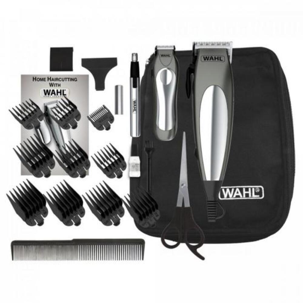 Kit Maquina E Aparador 220v Deluxe Groom Pro Prata WahlModelo: Deluxe Groom ProO Kit de Máquina de Corte e Aparador Wahl Deluxe Groom Pro é a escolha definitiva para cuidados pessoais masculinos. Inclui máquina de corte e aparador com lâminas autoafiáveis, alavanca ajustável para diversos tamanhos de corte, e lâminas de aço com alto teor de carbono para cortes suaves e precisos. Além disso, acompanha um aparador para nariz e orelhas, garantindo um cuidado completo e impecável.Voltagem: 220VCabo: 2,4 mInformação adicional:? Alimentação: Operação contínua / PilhaAcessórios:? Máquina de corte? Aparador de pelos para rosto e corpo? Aparador de pelos para nariz e orelhas? 8 pentes graduadores (#1, #2, #3, #4, #5, #6, #7 e #8)? Pentes graduadores para orelha esquerda e direita? Pente para pentear? Tesoura? Estojo de armazenamento? Óleo de lubrificação de lâmina? Pincel de limpeza? Protetor de lâmina