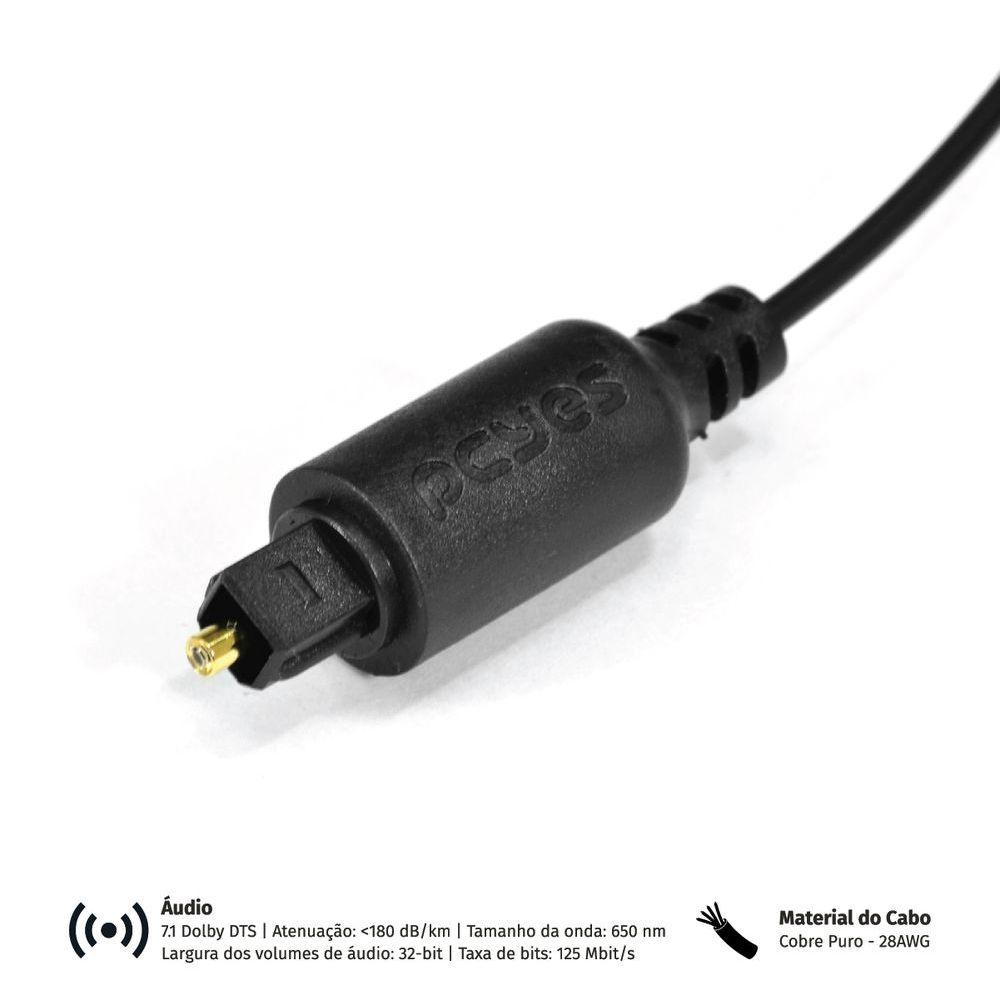 Cabo óptico Digital Toslink Macho 1 Metro - Pod-1Os cabos da PCYES chegaram para determinar um novo patamar de qualidade para aqueles que buscam mais para seus equipamentos de nível profissional, unindo inovação a um custo acessível!São duas linhas completamente desenvolvidas para suprir as necessidades até do consumidor mais exigente, utilizando de design, alta tecnologia e materiais de qualidade para alcançar a excelência.Projetados com foco nos entusiastas, os cabos da PCYES possuem design exclusivo e 100% brasileiro, que combina robustez com minimalismo, além de levar em si a essência da marca, garantindo maior durabilidade e desempenho.Descrição:Este cabo é indicado para dispositivos que possuam conexão CABO ÓPTICO tais como:Home theaters, Aparelhos Blu-ray, DVDs, Computadores, Sistemas de áudio profissionaisCaixas de som de alta performance.*Verificar a compatibilidade com o aparelho utilizado.Dados Técnicos:Tamanho do cabo: 1M28 AWGÁudio 7.1 Dolby DTSAtenuação:<180 dB/kmTamanho da onda: 650 nmLargura dos volumes de áudio: 32-bitTaxa de bits: 125 Mbit/s