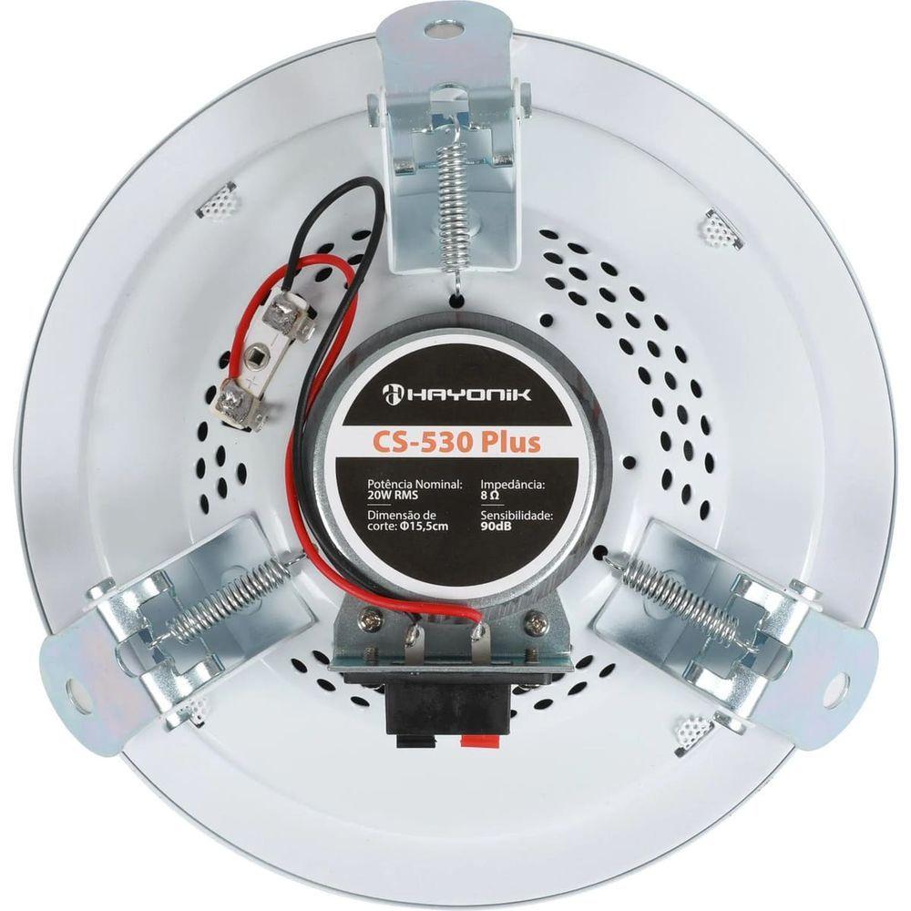 Arandela Hayonik Cs-530 Plus BrancaModelo: CS-530 PlusA Arandela Hayonik CS-530 Plus é uma solução acessível e de qualidade para quem busca uma sonorização eficiente em ambientes comerciais e residenciais.Com woofer de 5, ela faz parte da linha CS, que oferece opções versáteis com modelos CS e CS Plus. Ideal para espaços como hospitais, maternidades e ambientes corporativos, seu design discreto permite integração fácil e harmoniosa, sem comprometer o desempenho. Além disso, a Arandela Hayonik CS-530 Plus proporciona uma sonorização clara e confiável, garantindo praticidade e excelente performance sonora em diversas aplicações.EspecificaçõesCor: BrancaPotência: Nominal: 20W RMSSensibilidade: (1w/1m): 90dBImpedância: 8 ohmsDimensões: do produto: F180mmDimensões do corte: F155mmPeso: 0,600Resposta Frequência: 130Hz-18KHzOutrosInformação adicional:? Woofer: 5 (120mm) Cone de papel? Pintura eletrostática? Arandela e tela metálica? Proteção UV? Gabarito para corte
