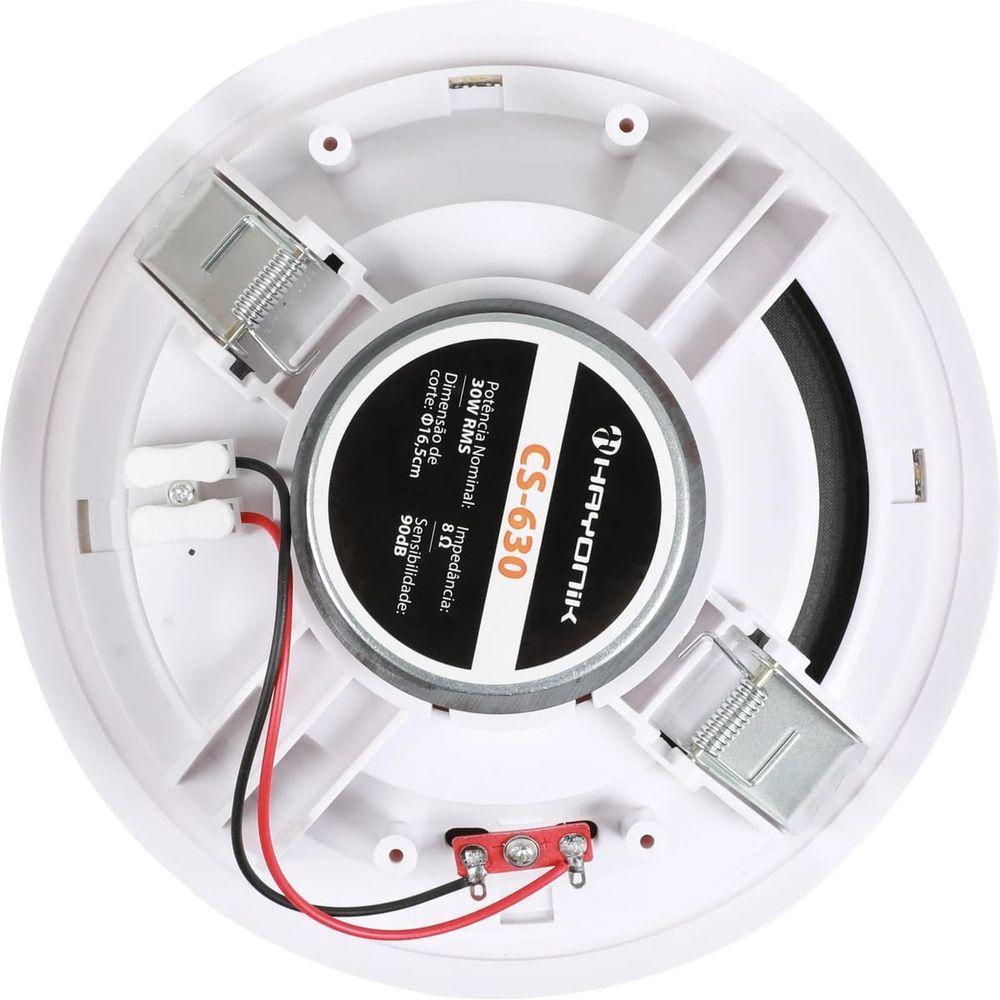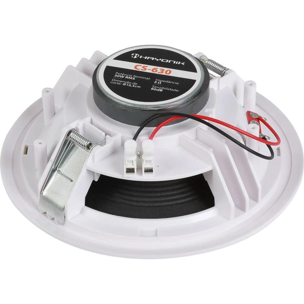 Arandela Hayonik Cs-630 Branca 30w RmsModelo: CS-630A Arandela Hayonik CS-630 é uma solução acessível e de qualidade para quem busca uma sonorização eficiente em ambientes comerciais e residenciais.Com woofer de 6,5, ela faz parte da linha CS, que oferece opções versáteis com modelos CS e CS Plus. Ideal para espaços como hospitais, maternidades e ambientes corporativos, seu design discreto permite integração fácil e harmoniosa, sem comprometer o desempenho. Além disso, a Arandela Hayonik CS-630 proporciona uma sonorização clara e confiável, garantindo praticidade e excelente performance sonora em diversas aplicações.EspecificaçõesCor: BrancaPotência: Nominal: 30W RMSSensibilidade: (1w/1m): 90dBImpedância: 8 ohmsDimensões: do produto: F185mmDimensões do corte: F165mmPeso: 0,600 KgResposta Frequência: 100Hz-18KHzOutrosInformação adicional:? Woofer: 6.5 (165mm) Cone de papel? Arandela plástica? Tela metálica? Proteção UV? Gabarito para corte