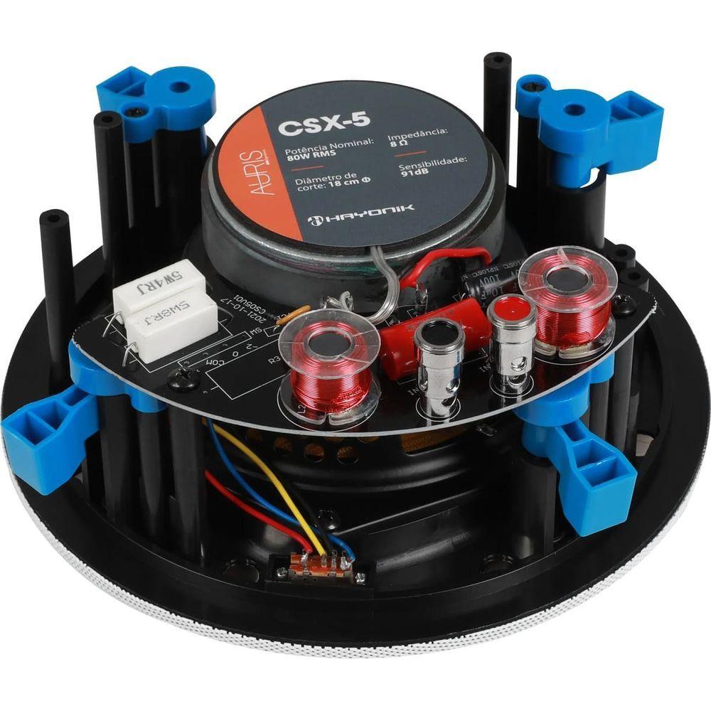 Arandela Hayonik Auris Csx-5 BrancaModelo: CSX-5A Arandela Hayonik Auris CSX-5 é a solução ideal para quem busca qualidade de som e estética sofisticada em ambientes modernos. Com tweeter direcionável e ajuste de agudo, este modelo proporciona um áudio de alta definição, permitindo a personalização sonora de acordo com a acústica do ambiente.Suas telas, com fixação por ímã, garantem praticidade na instalação e manutenção, enquanto o cone em fibra de vidro trançada oferece durabilidade e excelente desempenho sonoro. Outro diferencial dessa linha é o design borderless, com acabamento premium, este modelo se torna ideal para projetos arquitetônicos que exigem discrição e elegância. A facilidade de aplicação torna a Auris CSX-5 uma escolha indispensável para quem deseja aliar tecnologia e beleza em seus espaços.EspecificaçõesCor: BrancaPotência: Máxima (PMPO): 160 WPotência Nominal: 80 W RMSSensibilidade: (1w/1m) dB: 91dbImpedância: 8 OhmsDimensões: do produto: 19,6 cm x 9,3 cm (F x A)Dimensões do corte: F 18,0 cmPeso: 1,5 KgResposta Frequência: 70Hz-20KHzOutrosInformação adicional:? Divisor de frequências? Atenuador de frequência? Material da Grade: Alumínio? Material do Suporte: Alumínio? Woofer: 5,25 (13,3 cm) Cone de fibra de vidro trançada e com borda de borracha? Tweeter: 0,76 (1,9 cm) Domo de seda? Ajuste de direção do tweeter