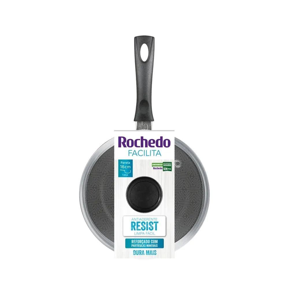 Panela Rochedo Facilita 16cm - 5861034137 VermelhoLinha Rochedo Facilita, com antiaderente Resist Limpa fácil, reforçado com partículas minerais: Dura mais. Com a Panela Rochedo Facilita Vermelha 16cm, você facilita seu dia a dia, com design moderno na cor vermelha, é o item ideal para sua cozinha. Conheça todos os diferenciais dessa linha:Antiaderente Resist: Limpa fácil e dura mais, reforçado com partículas minerais.Base Limpa Fácil: Não mancha, não gruda e é fácil de limpar.Tampa de vidro: Com saída de vapor.Cabos reforçados: mais segurança e conforto.Além de contar com a qualidade da marca Rochedo, presente no Brasil há mais de 100 anos, a Panela Rochedo Facilita Vermelha 16cm é livre de substâncias tóxicas (PFOA), garantindo a segurança no uso dos produtos. Pode ser utilizada em fogão a gás, vitrocerâmico e elétrico, podendo também ser levada à máquina de lavar louças.Conteúdo da Embalagem1 Panela 16cmRegistro no INMETRO007662/2023Instruções de CuidadosNão usar no micro-ondas e freezer. Prefira utensílios de cozinha não metálicos ao manuseá-la. Lave com o lado não abrasivo da esponja. Realize a cura inicial para ativar o antiaderente. Pode ir em todos os tipos de fogões, exceto indução.Benefício do produto? Antiaderente Resist: Limpa fácil e dura mais, reforçado com partículas minerais.? Thermo-Sinal: Muda de cor indicando o momento ideal para selar o seu alimento.? Base Limpa Fácil: Não mancha, não gruda e é fácil de limpar.? Cabos reforçados: mais segurança e conforto.CorVermelhoGarantia3 mesesTipo de MaterialAlumínioComp. Cabo (cm)14,4cmDiâmetro (em cm)16Volume1,5 litrosTipo de Embalagem IndividualAdesivo