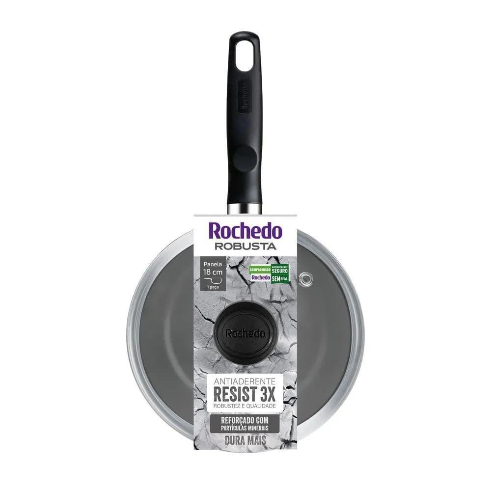 Panela Rochedo Robusta 18cm - 5861034873Linha Rochedo Robusta, com antiaderente Resist 3x que oferece maior robustez e qualidade. Reforçado com partículas minerais, dura mais. A Panela Rochedo Robusta Grafite 18cm irá surpreender sua família com sua durabilidade e resistência. Conheça todos os diferenciais dessa linha:Antiaderente Resist 3X: Robustez e Qualidade. Reforçado com partículas minerais, dura mais.Durabilidade e resistência: Alta espessura para durar mais.Base Limpa Fácil: Não mancha, não gruda e é fácil de limpar.Marcas de Medidas: Para facilitar o preparo.Além de contar com a qualidade da marca Rochedo, presente no Brasil há mais de 100 anos, a Panela Rochedo Robusta Grafite 18cm é livre de substâncias tóxicas (PFOA), garantindo a segurança no uso do produto. Pode ser utilizada em fogão a gás, vitrocerâmico e elétrico, podendo também ser levada à máquina de lavar louças.Conteúdo da Embalagem1 Panela 18cmRegistro no INMETRO007605/2024Instruções de CuidadosNão usar no micro-ondas e freezer. Prefira utensílios de cozinha não metálicos ao manuseá-la. Lave com o lado não abrasivo da esponja. Realize a cura inicial para ativar o antiaderente. Pode ir em todos os tipos de fogões, exceto indução. Compatível com máquina de lavar louças.Benefício do produto? Antiaderente Resist 3X: Robustez e Qualidade.? Reforçado com partículas minerais, dura mais.? Durabilidade e resistência: Alta espessura para durar mais.? Base Limpa Fácil: Não mancha, não gruda e é fácil de limpar.CorGrafiteGarantia3 mesesTipo de MaterialAlumínioComp. Cabo (cm)14,4cmDiâmetro (em cm)18cmVolume1,9LTipo de Embalagem IndividualLuva