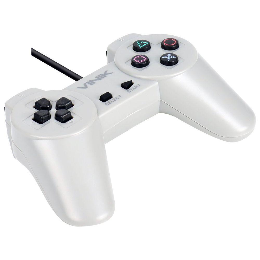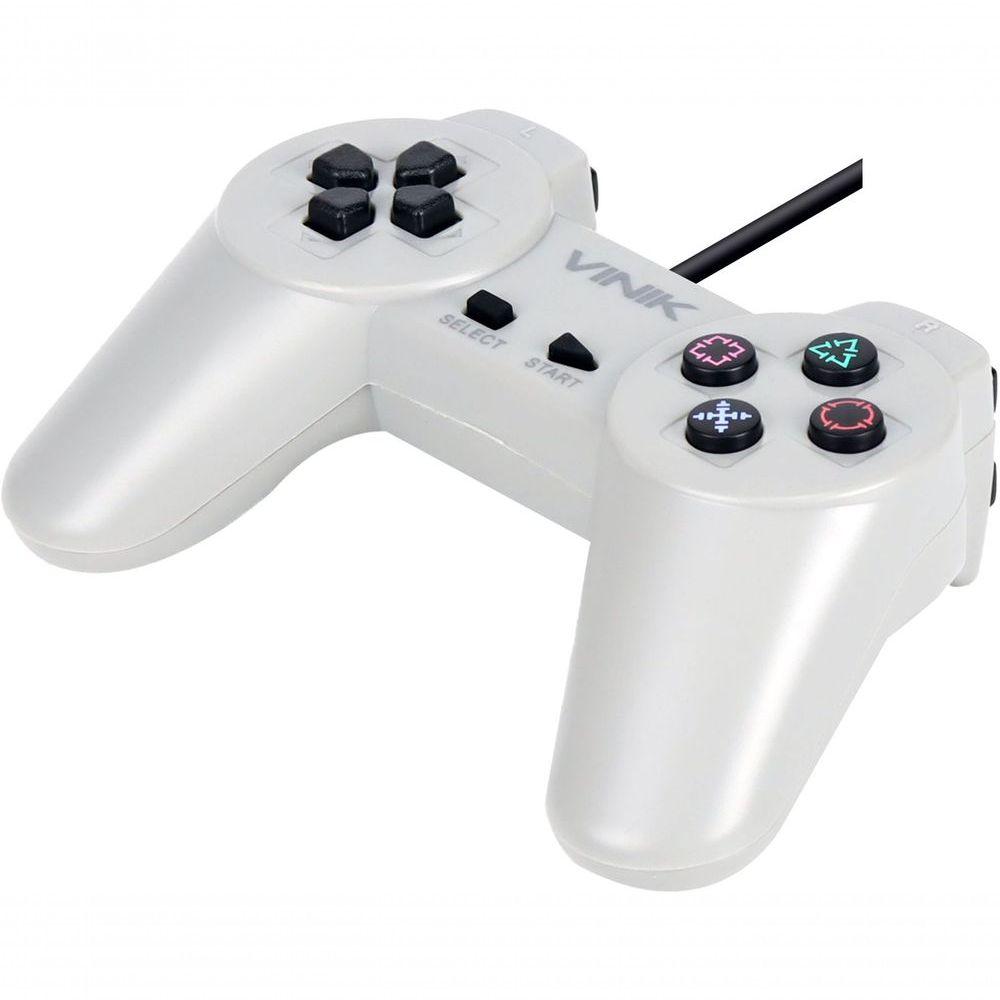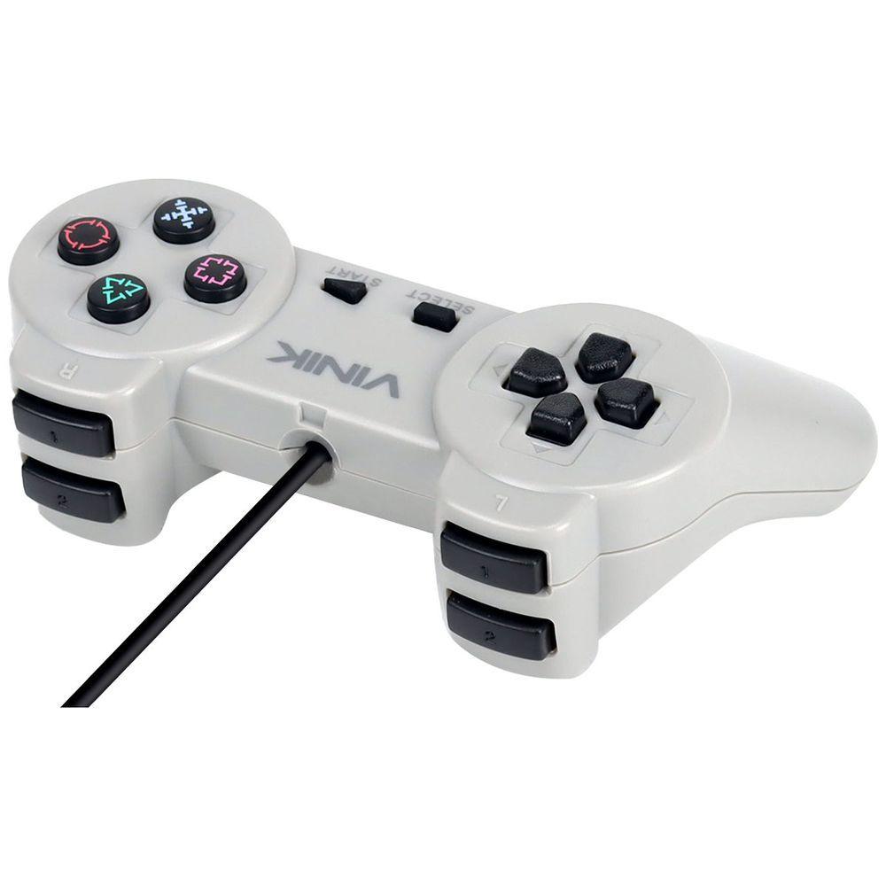 Controle Para Pc Com Fio Usb Modelo Play 1 CinzaPara os fãs de jogos clássicos dos anos 90, como Crash Bandicoot, Medal of Honor, entre outros jogos, a Vinik desenvolveu o controle Play 1, que possui entrada USB própria para jogos no PC.Botões + CaboCom design e acabamento semelhante ao controle tradicional, o controle Play1 tem todos os botões de comando convencionais, além do SELECT e START, L1, L2 e R1 e R2 e ainda dos direcionais em formato de cruz. O controle também possui cabo de 1.8M com entrada USB.Compatibilidade(Win98, ME, 2000, 2003, XP, Vista, Windows7, 8, 10, Mac)Plug and PlayPara facilitar o uso, o controle possui a tecnologia ?Plug and Play? (Conecte e Jogue), que dispensa a necessidade de instalação de softwares. É só conectar e jogar!
