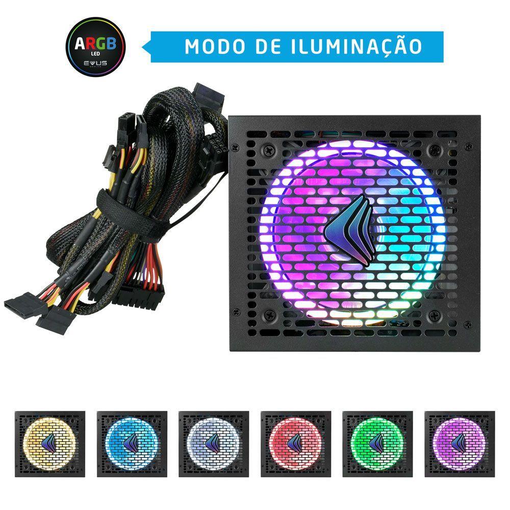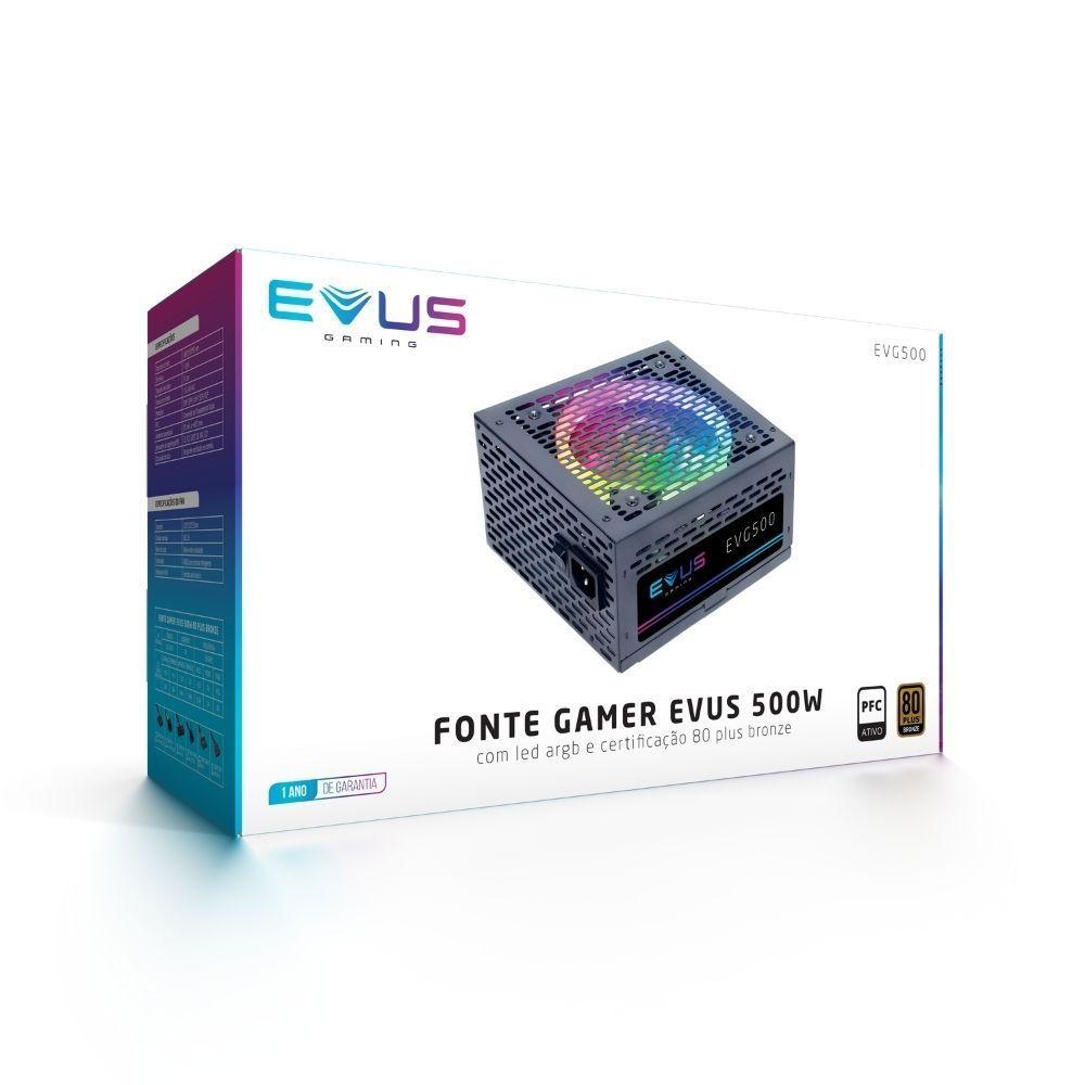 Fonte Gamer Evus Evg500 Argb 500wDESCRIÇÃO TÉCNICA A Fonte Gamer Evus EVG500 ARGB entrega eficiência energética e controle total de iluminação! Com o Selo 80 PLUS BRONZE, sua eficiência energética se mantém acima de 82%, o que significa menor dissipação de calor dentro do gabinete e economia de energia ao alimentar todo o seu hardware. Além disso, a fonte EVG500 possui PFC Ativo para conversão de chaveamento duplo (Bivolt), fornecendo 500W reais, e também conta com proteções tipo OVP OPP UVP SCP OCP. Com 6 conectores Sata e 2 Molex, a Fonte Gamer Evus EVG500 ARGB é muito versátil e discreta, pois todos os cabos são revestidos em nylon na cor Preta. Tenha o melhor da iluminação em LED, com múltiplos efeitos de iluminação e LED?s endereçáveis com a tecnologia ARGB*, através do cabo com conector 5v. Sincronize os efeitos dos LED?s com os demais componentes do seu gabinete, criando um estilo único e homogêneo em seu setup gamer. * Verifique a compatibilidade de sua placa-mãe ou controladora com conectores 5v e com a tecnologia ARGB. *Imagem meramente ilustrativa.ESPECIFICAÇÃO TÉCNICA Tamanho da fonte: 160*150*85 mm Eficiência:> 82% Tamanho dos cabos: 55 cm Tensão de entrada: 110-240 VAC PFC: Conversão de Chaveamento Duplo Ambiente operacional: 0ºC min. a +40ºC max. Aprovações de segurança: EMI CE, FCC, GOST, CB, EAC, CCP. Dissipação de calor: Design de ventilação em colméia Cabo de Energia: Incluso PROTEÇÕES Proteção contra sobrecorrente (OCP) Proteção contra sobretensão (OVP) Proteção contra subtensão (UVP) Proteção contra sobrecarga de energia (OPP) Proteção contra curto-circuito (SCP) ESPECIFICAÇÕES DO FAN Tamanho: 120*120*25mm Tensão nominal: DC12V Nível de ruído: Baixo ruído ondulação Iluminação: LED?s ARGB Rotação do FAN: Sentido anti-horário