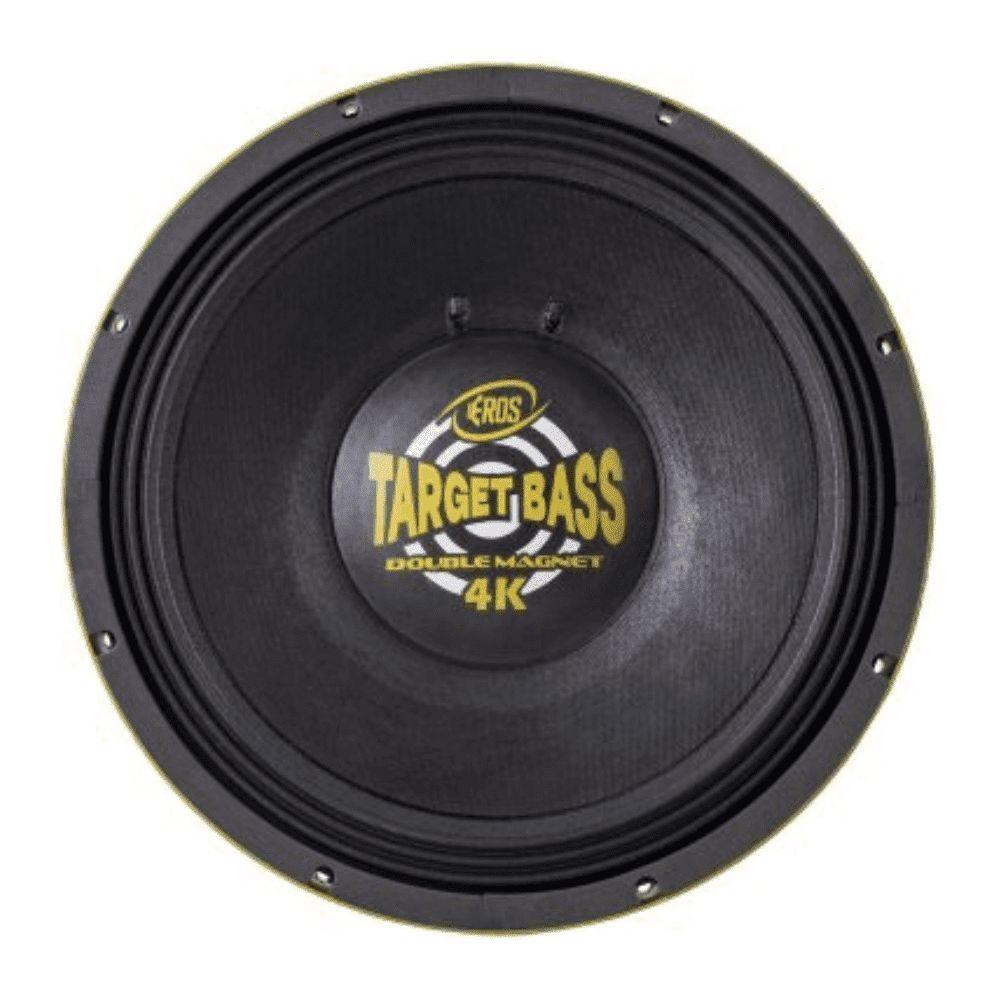Alto Falante Eros E-15 Target Bass 4k BrancoEspecificacao TecnicaO Verdadeiro grave, agora em dose dupla!O novo Target Bass 4k, suporta 2.000 Wrms, com resposta de frequencia estendida e impedancia em 4 Ohms. Agora com graves ainda mais envolventes e rmes e mantem as melhores caracteristicas das versoes anteriores.*Imagens meramente ilustrativas.DescricaoDIAMETRO NOMINAL15 PolegadasDIAMETRO FERRITE220 X 25 mm (117 X 18)MATERIAL DO FERRITEBARIODIAMETRO DA BOBINA4 polegadasFORMA DA BOBINAFIBERGLASSALTURA DA BOBINA29 mmALTURA DO GAP15,5 mmMATERIAL DO FIO DA BOBINACCAWSECCAO DO FIO DA BOBINARedonda AluminioPOTENCIA MAXIMA (RMS)2.000 WPOTENCIA MUSICAL4.000 WIMPEDANCIA NOMINAL4 OhmsRESPOSTA DE FREQUENCIA39 ~ 1.800Hz