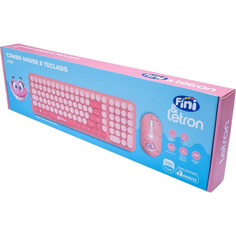 Kit Teclado E Mouse Letron Fini Sem Fio RosaModelo: FiniO Kit Teclado e Mouse Letron Fini traz design, diversão e praticidade para o seu dia a dia.Com 105 teclas ABNT, o teclado é leve, ergonômico e conta com sistema antiderramamento de água, garantindo conforto e resistência. O mouse, estampado com os personagens Fini, é prático e confortável. Ambos possuem conexão wireless, com dongle USB Plug and Play e alcance de até 10 metros, proporcionando total liberdade de movimento. Ideal para uso no escritório ou em casa, o combo torna tarefas de trabalho e estudo muito mais agradáveis e funcionais.Dimensões: do teclado: 13 x 40,2 x 3,5 cmDimensões do mouse: 5,9 x 10,5 x 3,5 cmCor: RosaConector: Wireless com mini receptor USB Plug and PlayTipo: ABNTNúmero de teclas: 105Informação adicional:? Peso do teclado: 519g? Peso do mouse: 142gIncluso:? 1 Mouse sem Fio? 1 Teclado sem Fio? 1 Receptor USB? 1 Cabo UB Micro para carregamento