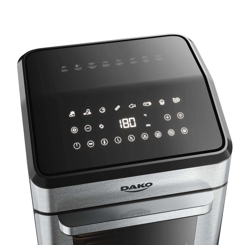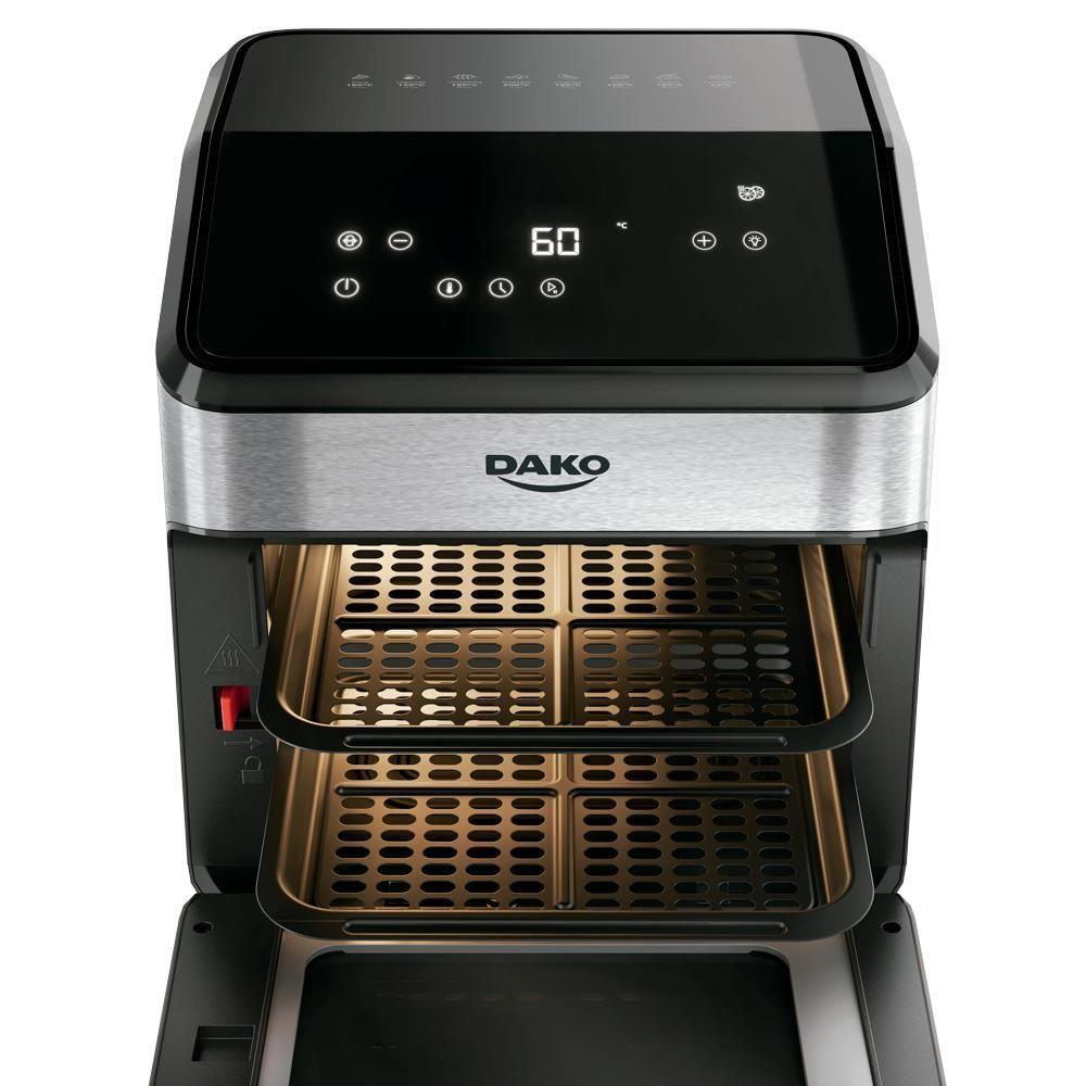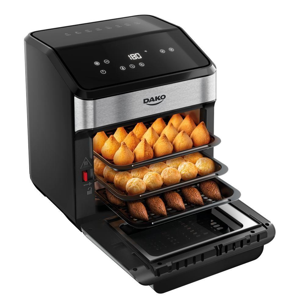 Fritadeira Air Fryer Oven Dako Grandes Apetites 12L 110VFritadeira Air Fryer Oven Dako Grandes Apetites 12L 110VPotência, versatilidade e grande capacidade para saciar grandes fomes.A Air Fryer Dako – Grandes Apetites de 12L é perfeita para saciar grandes fomes. Ela frita, desidrata, reaquece e assa com facilidade, ideal para preparar tanto pratos doces quanto salgados. Prática e segura, é uma ótima opção para lares com crianças e jovens independentes. Você pode programá-la para ligar e desligar nos horários desejados e receber avisos para chacoalhar os alimentos. A porta é removível e lavável, facilitando a limpeza. Com um design atraente e a tecnologia Dako, oferece excelente custo-benefício.Benefícios e RecursosVersatilidade 5 em 1: Frita, desidrata, reaquece, descongela e assa com um toque.Refeições saborosas para toda a família: Espaço ideal para grandes famílias e festas com crianças.Praticidade na sua rotina: A função Shake Time avisa quando chacoalhar os alimentos e você pode programar o início do preparo.Fácil de usar e limpar: Porta removível e acessórios antiaderentes.Airfryer + Forno (Fry Oven): 2 em 1, tudo que uma Airfryer tem com a capacidade e usabilidade de um forno.Capacidade útil: 12 L, grande volume, podendo fazer tanto frango como grandes quantidades de alimentos.Programar o produto: É possível definir quando a airfryer vai ligar após X tempo, programando o início do preparo da sua receita com o limite de 15hr.Rotisserie + acessórios: Espeto rotativo para fazer carnes e frangos + 3x grelhas com revestimento antiaderente e uma bandeja coletora, com profundidade adequada para acomodar melhor os alimentos.7x Funções pré-programáveis + desidratar: Praticidade, funções prontas, com apenas um clique já tem toda a configuração pronta pro alimento + desidratar.Luz interna: Facilidade de visualizar e acompanhar todo o preparo do alimento, sem ter que ficar abrindo a porta.Painel touch: Tecnologia e modernidade.Design + acabamento: Robusto, bonito, acabamento em inox.Shake time in: Feedback para auxiliar o consumidor nos preparos, podendo garantir uma cocção mais uniforme.Descongelar: Praticidade, agilidade, descongelar melhor que o microondas, preservando o aspecto do alimento.Reaquecer: Praticidade, volte a ter seu alimento como se fosse feito na hora, recuperando a crocância e o sabor.Pré-aquecimento: Precisão, praticidade, para aqueles mais exigentes que esperam o forno pré-aquecer e também para garantir a qualidade do preparo, preservando os sabores e garantindo cocção uniforme.Especificações TécnicasMarca: DakoVoltagem: 110VCor: InoxInstalação: Air FryerFuncionamento: ElétricoPotência: 1700WCapacidade do Cesto: 12 LitrosAjuste de Temperatura: 40°C a 200°CFormato do Cesto: QuadradoTimer Digital: SimLuz Indicadora de Funcionamento: SimFabricação: ImportadoPadrão de Tomada: 10AComprimento do Cabo de Energia: 96 cmEAN: 7897180598853SKU: 400000925Linha: DakoGrill: SimLuz indicativa: SimPainel: DigitalPlug (A): 10 ATipo de acabamento: InoxTipo: OvenTimer (minutos): 60 (Funções especiais até 15hr)Luz Interna: SimPré-programações: SimDesligamento automático: SimAcessórios: SimDescongelar: SimProgramar start: SimManter aquecido: SimPré-aquecimento: SimShake time: SimDimensões do Produto (L x A x P): 33,8 x 36,4 x 34,4 cmGarantia: 12 meses