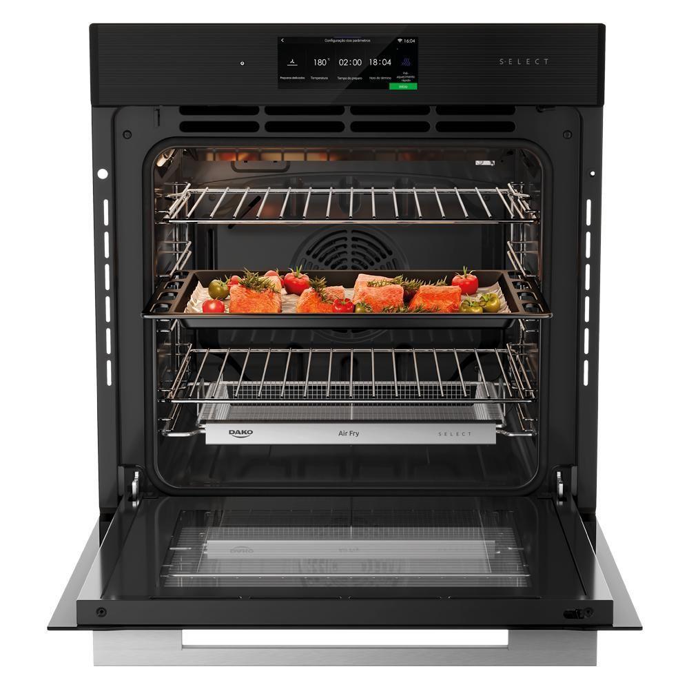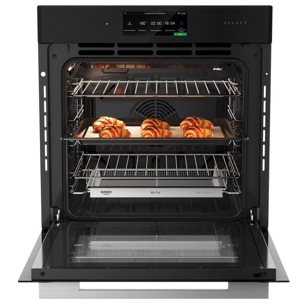 Forno Elétrico de Embutir 80L Dako Select 220VSeja para começar o dia, manter o ritmo durante o trabalho ou compartilhar momentos especiais, a Cafeteira Dako é sua companheira ideal para todas essas ocasiões.Com capacidade de 1,5 litro, ela prepara até 38 cafezinhos de uma só vez.O sistema corta-pingos permite servir sem sujeira, evitando desperdícios.Com a função manter aquecido, o café fica sempre quentinho por mais tempo, pronto para ser saboreado a qualquer hora.A linha Dako Select representa exclusividade e requinte, proporcionando uma experiência culinária única. Cada item combina tecnologia avançada com materiais de alta qualidade, estabelecendo padrões de excelência.O Forno Elétrico de Embutir Select foi projetado para atender aos mais altos padrões, com funcionalidades ativáveis pelo aplicativo Dako Select ou por comando de voz via , facilitando seu uso. A função Air Fryer permite preparar alimentos crocantes com menos óleo, promovendo refeições mais saudáveis. Com uma capacidade de 80 litros e 16 modos de preparo, este forno é ideal para diversas ocasiões, oferecendo 50 receitas pré-programadas que garantem resultados excepcionais.Seu design moderno conta com painel smart touch, timer digital e vidro triplo, assegurando e eficiência térmica. O vidro removível facilita a limpeza, e o forno oferece três opções de limpeza avançada: Pirolítico, com Vapor e Esterilizar.A linha Dako Select eleva sua cozinha a um patamar de sofisticação, transformando cada prato em uma obra-prima.Ficha Técnica:Voltagem: 220VCor: PretoLinha: SelectCapacidade do Forno: 80 LitrosFuncionamento: ElétricoGrill: SimIsolamento Térmico: SimLimpeza com Vapor: SimLuz no Forno: SimPrateleiras: 2 prateleirasCesto Air Fryer: 1 cestoBandeja Coletora: 1 bandejaGrill: SimAcabamento Interno do Forno: Esmalte Limpa FácilIsolamento Térmico: SimVariação de Temperatura (mín/máx): 30°C à 300°CLuz no Forno: SimPrateleiras: 2Cesto Air Fryer: 1Bandeja coletora: 1Níveis de Altura: 5Timer: DigitalAlarme sonoro: SimConvecção: SimReceitas Pré-Programadas: SimDescongelamento: SimFunção Air Fryer: SimManter Aquecido: SimAquecer Prato: SimCrescer Massa - Fermentar: SimDesidratar: SimSensor Pré-Aquecimento: SimLimpeza com Vapor: SimEsterilizar: SimVidro Triplo: SimPuxador: AlumínioTomada (A): 16 ADimensões do Produto (L x A x P): 59,4 x 59,4 x 49,8 cmDimensões do Nicho (L x A x P): 55,8 x 58,7 x 57 cmMedidas do Nicho (L x A x P) em CM: 55,8 x 58,7 x 57Dimensões do Produto (L x A x P) cm: 59,4 x 59,4 x 49,8Peso do Produto: 34,5 KgPainel Digital: SimAbertura de Porta: Vertical com parada intermediáriaVidro Interno Removível: SimFood Sensor: NãoPotência do Grill: 1300WPotência da Resistência Superior: 1000WPotência da Resistência Inferior: 1000WPotência da Resistência Circular: 1800WPotência do Forno (W): 3000WVálvula de : NãoCor: PretoConectividade: SimComando de Voz: SimPlug (A): SimGarantia: 12 Meses