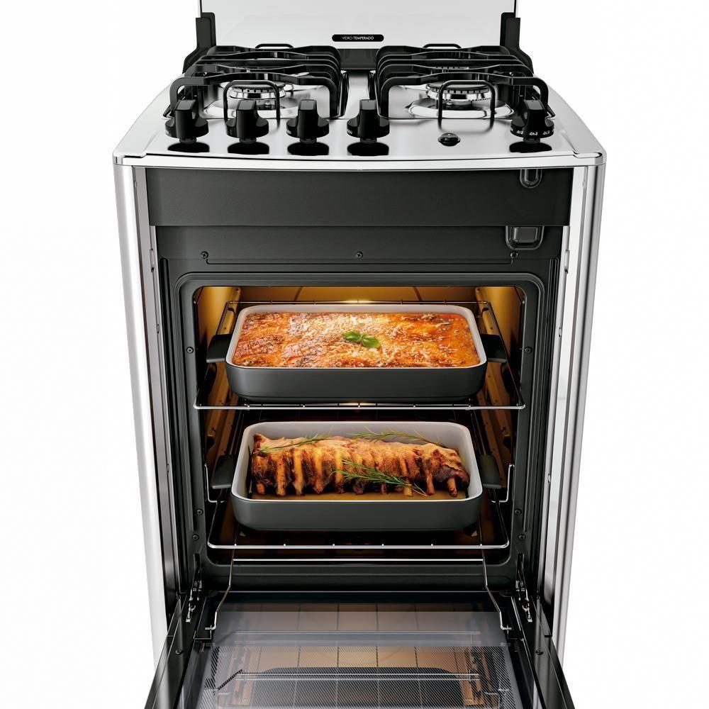 Fogão 4 Bocas Dako Magister Style Mesa Inox Espelhado Preto BivoltO Magister Inox Style é ideal para quem valoriza design e modernidade, oferecendo um produto sofisticado e cheio de recursos.Seu design impressiona com porta em vidro espelhado, cantoneiras em inox e puxador em alumínio escovado, conferindo um visual moderno e luxuoso para a sua cozinha.Conta com acendimento automático e Mega Chama, permitindo cozinhar mais rápido, deixando mais tempo para curtir com os entes queridos.Além disso, as grades duplas de piatina são robustas e oferecem maior segurança no manuseio das panelas.Ficha TécnicaMarca: DakoLinha: Magister StyleCor: Espelhado / PretoQuantidade de queimadores: 4 bocasAcendimento: AutomáticoFuncionamento: GásVoltagem: BivoltPadrão de tomada: 10ATampa: SimTipo de montagem: De pisoFabricação: NacionalEficiência Energética: AGarantia: 12 mesesDimensões do ProdutoLargura: 51,5 cmAltura: 96,0 cmProfundidade: 63,3 cmPeso: 27,7 kgComprimento do cabo de energia: 96 cmPotência dos Queimadores2 queimadores Ramal: 1,7kW1 queimador Família: 2,0kW1 queimador Mega Chama: 2,5kWDetalhes do FornoCapacidade: 60 litrosAcabamento: Limpa FácilLuz interna: Sim (lâmpada 220V acompanha o produto)Vidro do forno: Vidro DuploTipo de forno: Com visorGrades do forno:1 grade deslizante1 grade auto deslizanteOutros DestaquesAcabamento da mesa: InoxTrempes (grades superiores): Dupla de PiatinaSistema corta/bloqueia gás: SimAtenção nas compras com CNPJPara que o pedido seja processado corretamente, é obrigatório informar no momento da compra:Se o CNPJ é Contribuinte, deve-se indicar se o cliente é Isento ou possui Inscrição Estadual (IE)Se o CNPJ é Não Contribuinte, essa condição também deve ser informada (ex.: Isento)