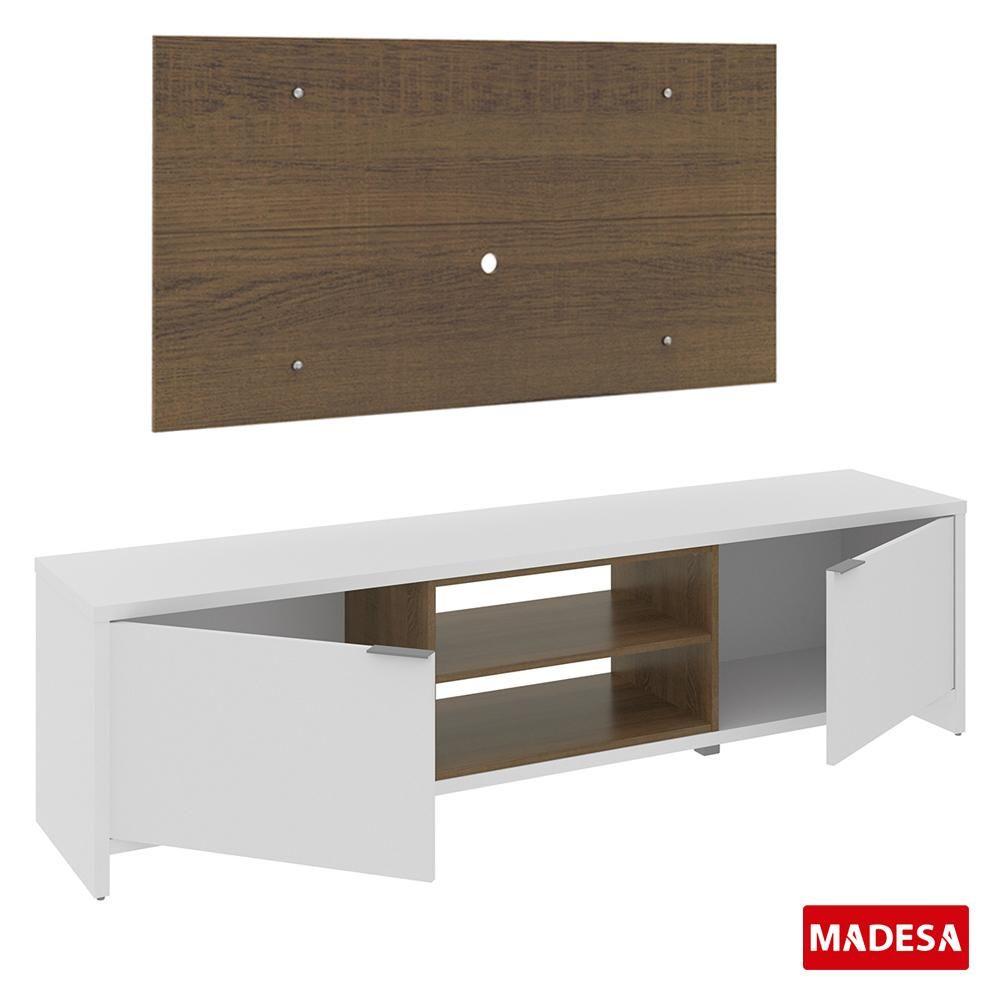 Rack Metz Branco e Painel para TV Rustic MadesaO conjunto ideal para sua sala de estar!Características do Produto:- Dispõe de duas portas grandes e nichos abertos que acomodam os aparelhos eletrônicos de maneira prática.- É um móvel robusto e com bastante espaço útil.- Painel para televisores de até 50 polegadas.- Acabamento em Pintura Poliéster de sete camadas de alta resistência, detalhe que confere maior qualidade e durabilidade aos móveis.Especificações Técnicas:- Marca: Madesa- Televisores Suportados: Até 50"- Dimensões do Rack (LxAxP): 180 cm X 48 cm X 39 cm- Dimensões do Painel (LxAxP): 136 cm X 72 cm X 2 cm- Dimensões da Embalagem (LxAxP): 43 x 23 x 194 cm- Peso da Embalagem: 49,3 kg- Cor do Rack: Branco- Cor do Painel: Textura Rustic- Referência: MDES0200029B5ZGarantia: 3 meses