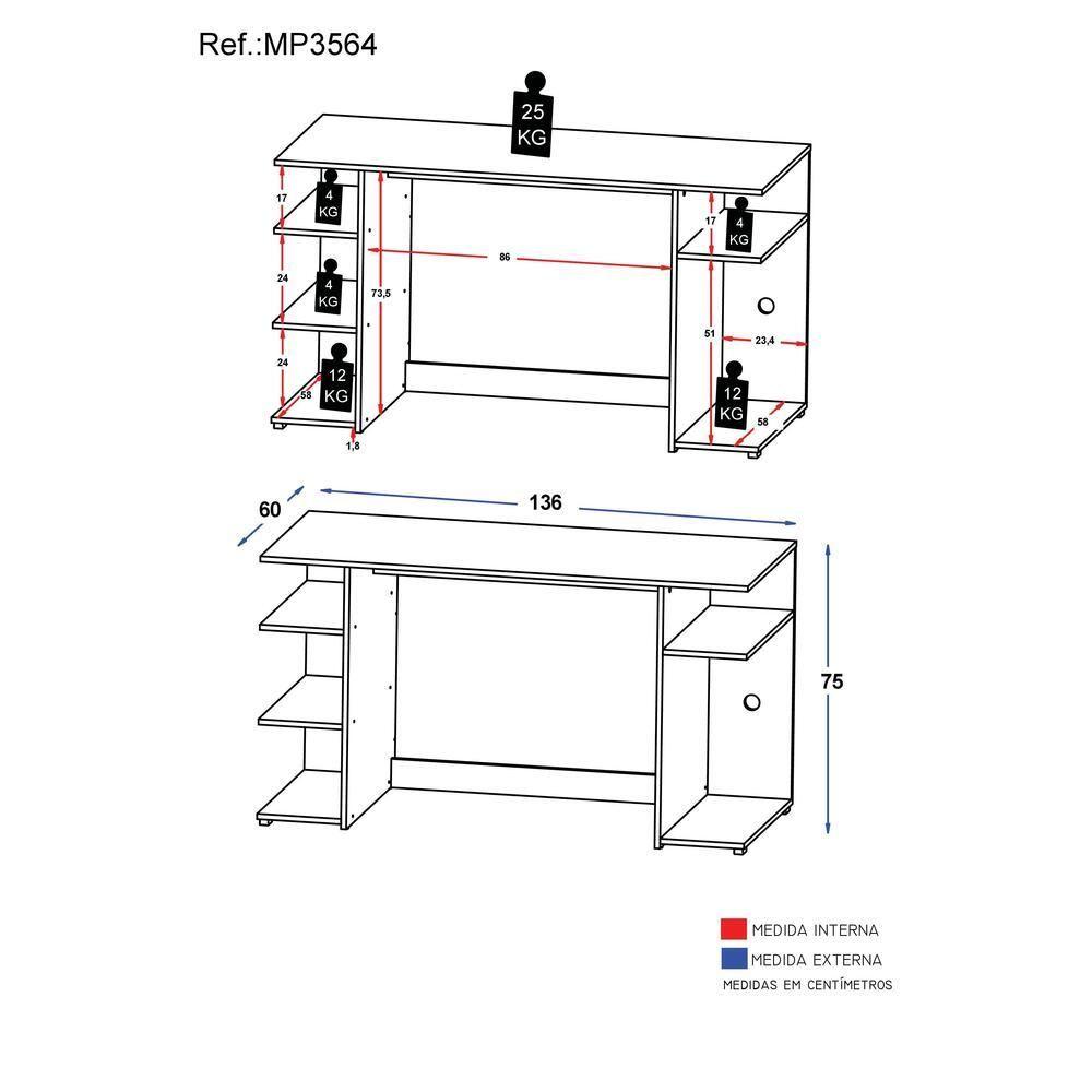 Mesa Gamer Escrivaninha Guilda Multimóveis Branca acabamento: finish foilcor: brancotonalidade: brancomaterial: mdpreferência do modelo: mp3564coleção: guildainstruções de cuidado: limpar com pano seco para retirar o. pó. não utilizar produtos químicos ou abrasivos a. limpeza. não aplicar lustra móveis.sistema de montagem: o. produto acompanha manual de montagem juntamente com parafusos, pregos, cavilhas, entre outros. o. produto será entregue desmontado e. a. multimóveis não disponibiliza o. serviço de montagem.produto composto por: 1 mesa, manual de montagem e. kit ferragem.altura montado: 75largura montado: 136profundidade montado: 60tamanho (l x. a. x. p): 136 x. 75 x. 60prateleiras: 3gavetas: 0com gavetas: nãoé. em forma de l.: nãoé. gamer: simrequer montagem: simfabricante: multimóveispeso do produto: 28.50produto: conjunto de escritóriogarantia do fabricante: 3altura (cm): 75 cmcomprimento: n/alargura (cm): 136 cmprofundidade (cm): 60 cmmaterial da mesa: mdpa mesa gamer escrivaninha guilda multimóveis vai deixar o seu ambiente moderno e confortável para você curtir os melhores momentos de jogo e descontração. produzida em mdp com acabamento acetinado (cerca de 20% de brilho), que garante maior durabilidade e resistência, conta com várias prateleiras para organizar seus pertences e um tampo amplo (suporta 25kg), com bastante espaço para os equipamentos e acessórios. o design clean, com linhas retas, torna o móvel muito versártil, permitindo ser utilizado também como escrivaninha ou mesmo em um ambiente office.conteúdo da embalagem:1 (uma) mesadimensões do produto montado:altura: 75cm - largura: 136cm - profundidade: 60cm*você pode consultar as medidas internas na imagem técnica do produto.disponível em 2 cores:branco - pretoimagem meramente ilustrativa. decoração e equipam