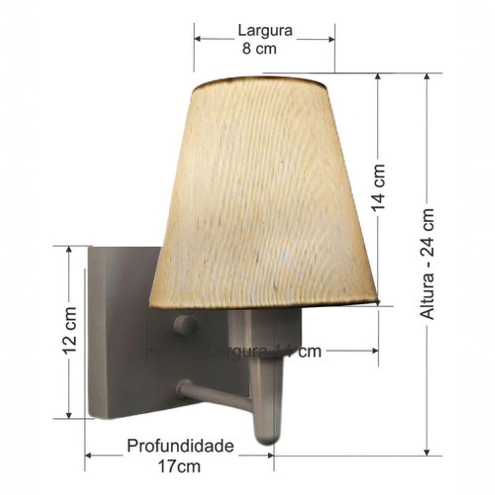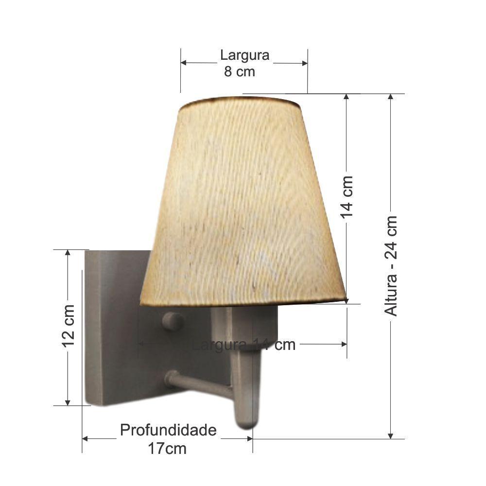 Arandela Quadrada Md-2034 Cinza Cúpula Em Tecido Cone Linho Bege - BivoltArandela de parede Quadrada Md-2034 Cinza Cúpula em Tecido Cone Linho Bege - BivoltAs arandelas Lustres Vivare são elementos versáteis e elegantes que podem transformar qualquer ambiente em um espaço cheio de estilo. Seja para adicionar uma iluminação suave, destacar uma parede ou criar um efeito de luz diferenciado.Dimensão:Cúpula em Tecido: 14x07x14cmArandela de parede Montada: Altura 24cm Largura 14cm Profundidade 17cmFormato: Quadrado / ConeTamanho: PequenoEspecificação:Material: Cúpula em TecidoEstrutura em AlumínioBase Parede: Quadrado 12x12x2cmResistente: Á MaresiaVoltagem: 110V/220VLiga e Desliga: NãoTipo de Soquete: E27Lâmpada Utilizada: Led Bulbo Até 16w ou Fluorescente Espiral Até 25w cadaCapacidade de Lâmpadas: 1Observação:Acompanha Lâmpada: NãoPossui Led Integrado: NãoGarantia: 12 MesesManual de Instalação: SimArandela de parede Montada: SimControle de Luminosidade: NãoTipo de Embalagem: CaixaConservação e Manutenção do Produto:A Limpeza deve ser realizada com o produto desligado. Remova o lustre que pode ser lavado com sabão neutro. Nunca utilize produtos químicos e abrasivosDica:Antes de comprar o seu produto verifique as medidas, o local onde pretende instalar e se necessário o serviço de um profissional qualificado.