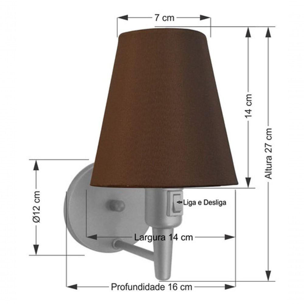 Kit/2 Arandela Cone Md-2013 Cinza C/ Inter Liga E Desl Cúpula Em Tecido Café - BivoltKit/2 Arandela de parede Cone Md-2013 Cinza C/ Inter Liga e Desl Cúpula Tecido CaféAs arandelas Lustres Vivare são elementos versáteis e elegantes que podem transformar qualquer ambiente em um espaço cheio de estilo. Seja para adicionar uma iluminação suave, destacar uma parede ou criar um efeito de luz diferenciado.Dimensão:Cúpula em Tecido: 14x07x14cmArandela de parede Montada: Altura 27cm Largura 14cm Profundidade 16cmFormato: ConeTamanho: PequenoEspecificação:Material: Cúpula em TecidoEstrutura em AlumínioBase Parede: Diâmetro 11x1,2cmResistente: Á MaresiaVoltagem: 110V/220VLiga e Desliga: Interruptor no SoqueteTipo de Soquete: E27Tipo de Lâmpada: Led Bulbo até 16w ou Fluorescente Espiral até 25w CadaCapacidade de Lâmpadas: 1Observação:Acompanha Lâmpada: NãoPossui Led Integrado: NãoGarantia: 12 MesesManual de Instalação: SimArandela de parede Montada: SimControle de Luminosidade: NãoTipo de Embalagem: CaixaConservação e Manutenção do Produto:A Limpeza deve ser realizada com o produto desligado. Remova o lustre que pode ser lavado com sabão neutro. Nunca utilize produtos químicos e abrasivosAntes de comprar o seu produto verifique as medidas, o local onde pretende instalar e se necessário o serviço de um profissional qualificado.