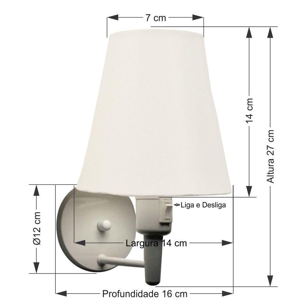 Arandela Cone Md-2013 Branco C/ Inter Liga E Desl Cúpula Em Tecido Branco - BivoltArandela de parede Cone Md-2013 Branca C/ Inter Liga e Desl Cúpula Tecido Branco As arandelas Lustres Vivare são elementos versáteis e elegantes que podem transformar qualquer ambiente em um espaço cheio de estilo. Seja para adicionar uma iluminação suave, destacar uma parede ou criar um efeito de luz diferenciado. Dimensão:Cúpula em Tecido: 14x07x14cmArandela de parede Montada: Altura 27cm Largura 14cm Profundidade 16cmFormato: ConeTamanho: Pequeno Especificação:Material: Cúpula em TecidoEstrutura em AlumínioBase Parede: Diâmetro 11x1,2cmResistente: Á MaresiaVoltagem: 110V/220VLiga e Desliga: Interruptor no SoqueteTipo de Soquete: E27Tipo de Lâmpada: Led Bulbo até 16w ou Fluorescente Espiral até 25w CadaCapacidade de Lâmpadas: 1 Observação:Acompanha Lâmpada: NãoPossui Led Integrado: NãoGarantia: 12 MesesManual de Instalação: SimArandela de parede Montada: SimControle de Luminosidade: NãoTipo de Embalagem: Caixa Conservação e Manutenção do Produto:A Limpeza deve ser realizada com o produto desligado. Remova o lustre que pode ser lavado com sabão neutro. Nunca utilize produtos químicos e abrasivosAntes de comprar o seu produto verifique as medidas, o local onde pretende instalar e se necessário o serviço de um profissional qualificado.