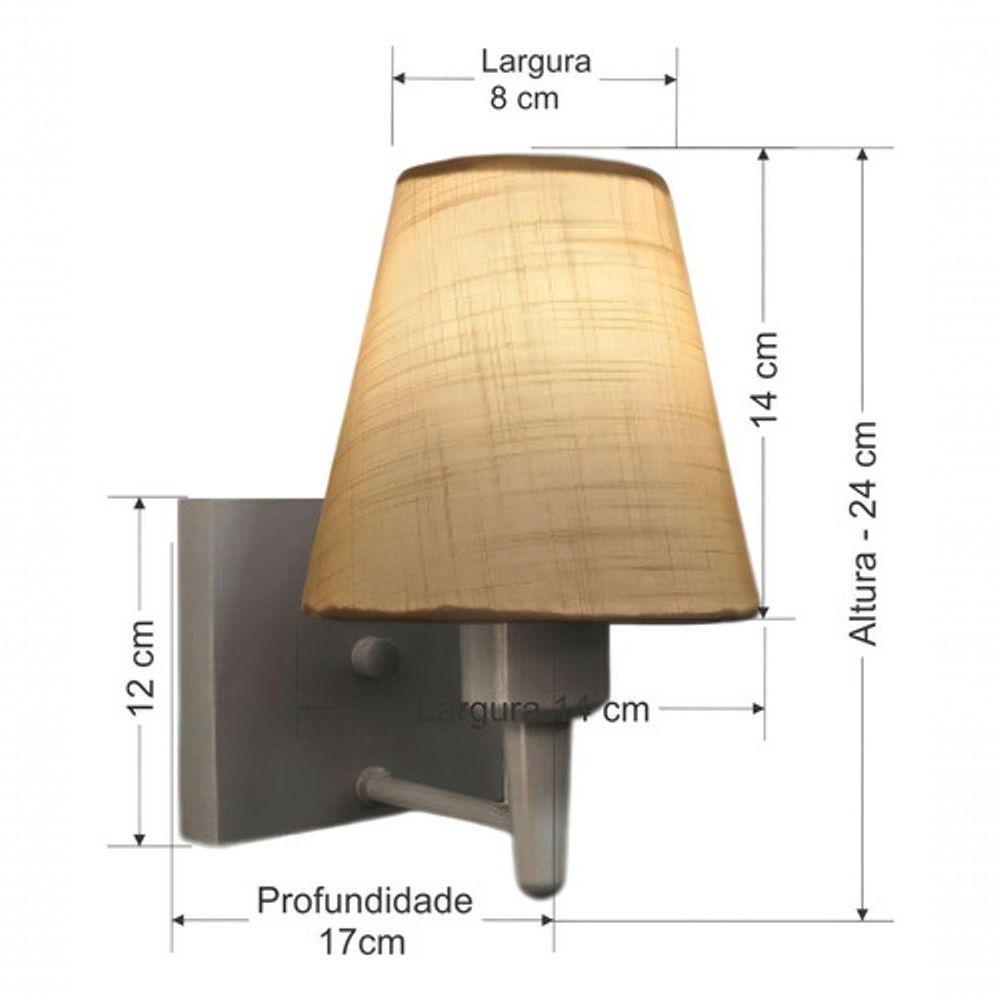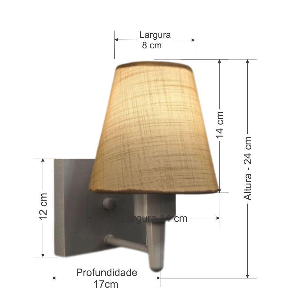Arandela Quadrada Md-2034 Cinza Cúpula Em Tecido Cone Palha - BivoltArandela de parede Quadrada Md-2034 Cinza Cúpula em Tecido Cone Palha - BivoltAs arandelas Lustres Vivare são elementos versáteis e elegantes que podem transformar qualquer ambiente em um espaço cheio de estilo. Seja para adicionar uma iluminação suave, destacar uma parede ou criar um efeito de luz diferenciado.Dimensão:Cúpula em Tecido: 14x07x14cmArandela de parede Montada: Altura 24cm Largura 14cm Profundidade 17cmFormato: Quadrado / ConeTamanho: PequenoEspecificação:Material: Cúpula em TecidoEstrutura em AlumínioBase Parede: Quadrado 12x12x2cmResistente: Á MaresiaVoltagem: 110V/220VLiga e Desliga: NãoTipo de Soquete: E27Lâmpada Utilizada: Led Bulbo Até 16w ou Fluorescente Espiral Até 25w cadaCapacidade de Lâmpadas: 1Observação:Acompanha Lâmpada: NãoPossui Led Integrado: NãoGarantia: 12 MesesManual de Instalação: SimArandela de parede Montada: SimControle de Luminosidade: NãoTipo de Embalagem: CaixaConservação e Manutenção do Produto:A Limpeza deve ser realizada com o produto desligado. Remova o lustre que pode ser lavado com sabão neutro. Nunca utilize produtos químicos e abrasivosDica:Antes de comprar o seu produto verifique as medidas, o local onde pretende instalar e se necessário o serviço de um profissional qualificado.
