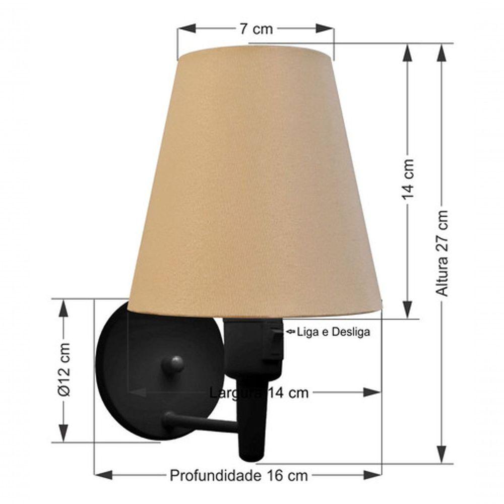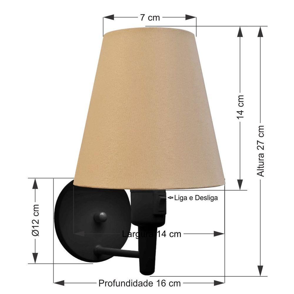 Kit/2 Arandela Cone Md-2013 Preto C/ Inter Liga E Desl Cúpula Em Tecido Palha - BivoltKit/2 Arandela de parede Cone Md-2013 Preto C/ Inter Liga e Desl Cúpula Tecido PalhaAs arandelas Lustres Vivare são elementos versáteis e elegantes que podem transformar qualquer ambiente em um espaço cheio de estilo. Seja para adicionar uma iluminação suave, destacar uma parede ou criar um efeito de luz diferenciado.Dimensão:Cúpula em Tecido: 14x07x14cmArandela de parede Montada: Altura 27cm Largura 14cm Profundidade 16cmFormato: ConeTamanho: PequenoEspecificação:Material: Cúpula em TecidoEstrutura em AlumínioBase Parede: Diâmetro 11x1,2cmResistente: Á MaresiaVoltagem: 110V/220VLiga e Desliga: Interruptor no SoqueteTipo de Soquete: E27Tipo de Lâmpada: Led Bulbo até 16w ou Fluorescente Espiral até 25w CadaCapacidade de Lâmpadas: 1Observação:Acompanha Lâmpada: NãoPossui Led Integrado: NãoGarantia: 12 MesesManual de Instalação: SimArandela de parede Montada: SimControle de Luminosidade: NãoTipo de Embalagem: CaixaConservação e Manutenção do Produto:A Limpeza deve ser realizada com o produto desligado. Remova o lustre que pode ser lavado com sabão neutro. Nunca utilize produtos químicos e abrasivosAntes de comprar o seu produto verifique as medidas, o local onde pretende instalar e se necessário o serviço de um profissional qualificado.