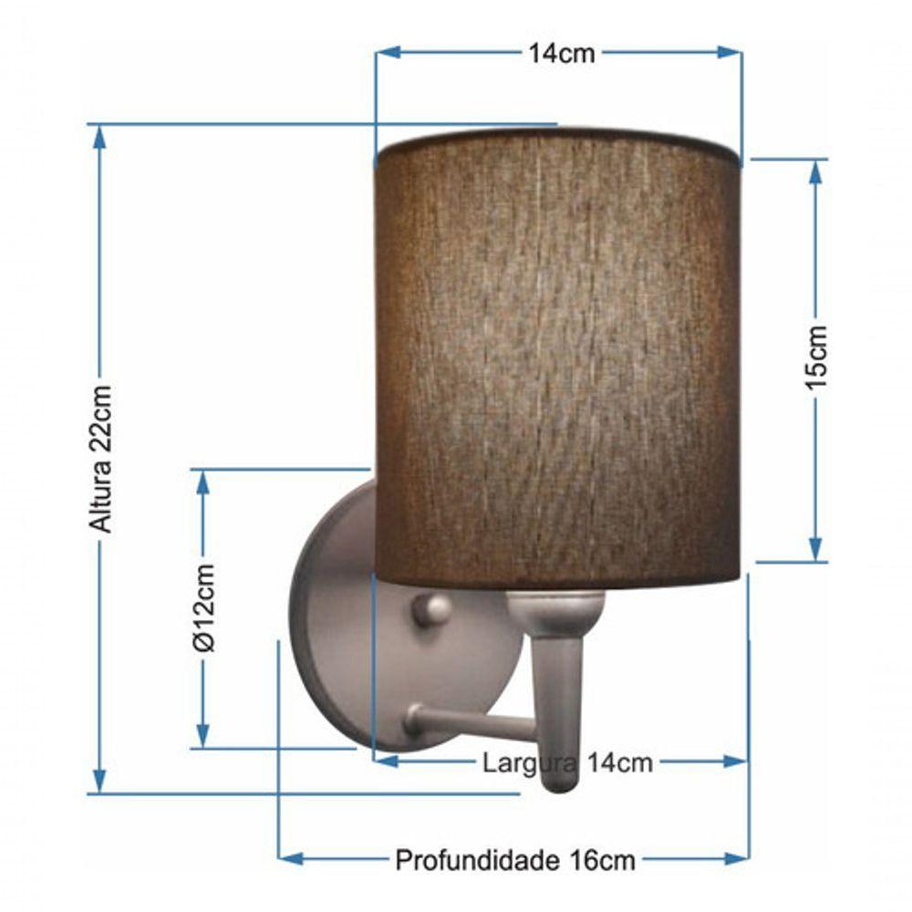 Kit/2 Arandela Cilíndrica Md-2009 Base Cinza Cúpula Em Tecido 14x15cm Caqui - BivoltKit/2 Arandela de parede Cilíndrica Md-2009 Base Cinza Cúpula em Tecido 14x15cm Caqui - BivoltAs arandelas Lustres Vivare são elementos versáteis e elegantes que podem transformar qualquer ambiente em um espaço cheio de estilo. Seja para adicionar uma iluminação suave, destacar uma parede ou criar um efeito de luz diferenciado.Dimensão:Cúpula em Tecido: 14x15cmArandela de parede Montada: Altura 22cm Largura 14cm Profundidade 16cmFormato: CilíndricoTamanho: PequenoEspecificação:Material: Cúpula em TecidoEstrutura em AlumínioBase Parede: Diâmetro 11x1,2cmResistente: Á MaresiaVoltagem: 110V/220VLiga e Desliga: NãoTipo de Soquete: E27Lâmpada Utilizada: Led Bulbo até 16w ou Fluorescente Espiral até 25w CadaCapacidade de Lâmpadas: 1Observação:Acompanha Lâmpada: NãoPossui Led Integrado: NãoGarantia: 12 MesesManual de Instalação: SimArandela de parede Montada: SimControle de Luminosidade: NãoTipo de Embalagem: CaixaConservação e Manutenção do Produto:A Limpeza deve ser realizada com o produto desligado. Remova o lustre que pode ser lavado com sabão neutro. Nunca utilize produtos químicos e abrasivosDica:Antes de comprar o seu produto verifique as medidas, o local onde pretende instalar e se necessário o serviço de um profissional qualificado.