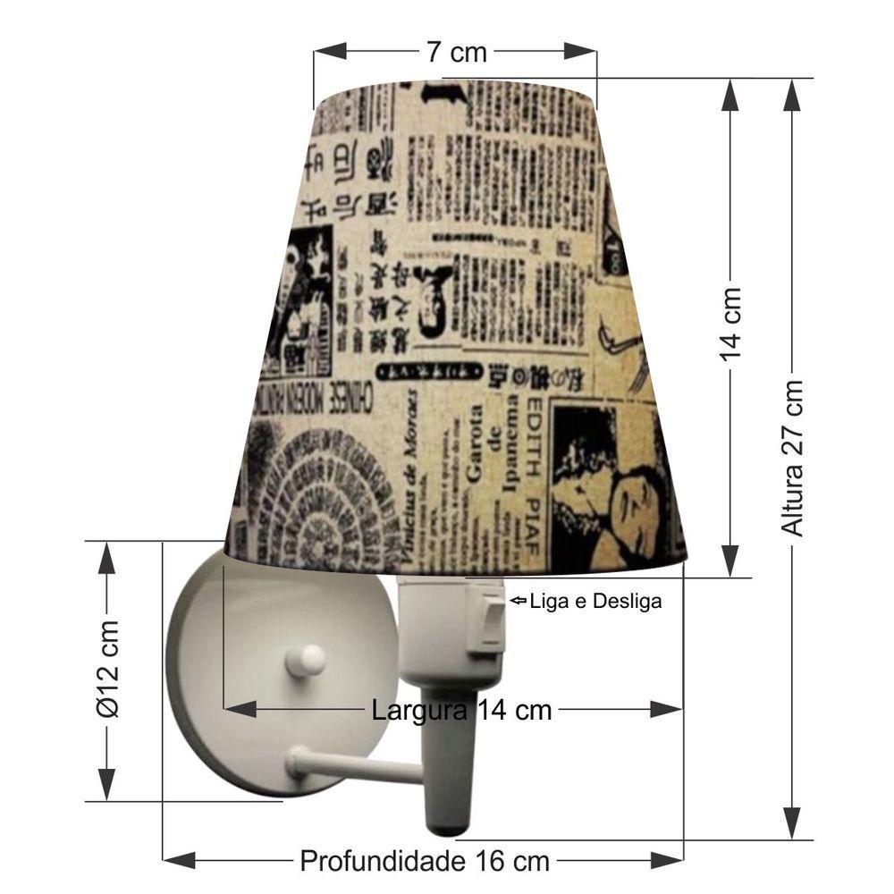 Arandela Cone Md-2013 Branco C/ Inter Liga E Desl Cúpula Em Tecido Ny-jornal - BivoltArandela de parede Cone Md-2013 Branca C/ Inter Liga e Desl Cúpula Tecido JornalAs arandelas Lustres Vivare são elementos versáteis e elegantes que podem transformar qualquer ambiente em um espaço cheio de estilo. Seja para adicionar uma iluminação suave, destacar uma parede ou criar um efeito de luz diferenciado.Dimensão:Cúpula em Tecido: 14x07x14cmArandela de parede Montada: Altura 27cm Largura 14cm Profundidade 16cmFormato: ConeTamanho: PequenoEspecificação:Material: Cúpula em TecidoEstrutura em AlumínioBase Parede: Diâmetro 11x1,2cmResistente: Á MaresiaVoltagem: 110V/220VLiga e Desliga: Interruptor no SoqueteTipo de Soquete: E27Tipo de Lâmpada: Led Bulbo até 16w ou Fluorescente Espiral até 25w CadaCapacidade de Lâmpadas: 1Observação:Acompanha Lâmpada: NãoPossui Led Integrado: NãoGarantia: 12 MesesManual de Instalação: SimArandela de parede Montada: SimControle de Luminosidade: NãoTipo de Embalagem: CaixaConservação e Manutenção do Produto:A Limpeza deve ser realizada com o produto desligado. Remova o lustre que pode ser lavado com sabão neutro. Nunca utilize produtos químicos e abrasivosAntes de comprar o seu produto verifique as medidas, o local onde pretende instalar e se necessário o serviço de um profissional qualificado.