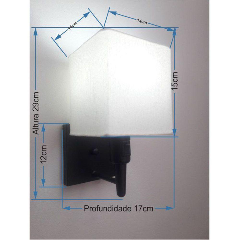 Arandela Quadrada Md-2019 Preto C/ Inter Liga E Desl Cúpula Em Tecido Branco - BivoltArandela de parede Quadrada Md-2019 Preta C/ Inter Liga e Desl Cúpula Tecido BrancoAs arandelas Lustres Vivare são elementos versáteis e elegantes que podem transformar qualquer ambiente em um espaço cheio de estilo. Seja para adicionar uma iluminação suave, destacar uma parede ou criar um efeito de luz diferenciado.Dimensão:Cúpula em Tecido: 15x14x14cmArandela de parede Montada: Altura 29cm Largura 14cm Profundidade 17cmFormato: QuadradoTamanho: PequenoEspecificação:Material: Cúpula em TecidoEstrutura em AlumínioBase Parede: Quadrado 12x12x2cmResistente: Á MaresiaVoltagem: 110V/220VLiga e Desliga: Interruptor no SoqueteTipo de Soquete: E27Lâmpada Utilizada: Led Bulbo Até 16w ou Fluorescente Espiral Até 25w CadaCapacidade de Lâmpadas: 1Observação:Acompanha Lâmpada: NãoPossui Led Integrado: NãoGarantia: 12 MesesManual de Instalação: SimArandela de parede Montada: SimControle de Luminosidade: NãoTipo de Embalagem: CaixaConservação e Manutenção do Produto:A Limpeza deve ser realizada com o produto desligado. Remova o lustre que pode ser lavado com sabão neutro. Nunca utilize produtos químicos e abrasivosDica:Antes de comprar o seu produto verifique as medidas, o local onde pretende instalar e se necessário o serviço de um profissional qualificado.
