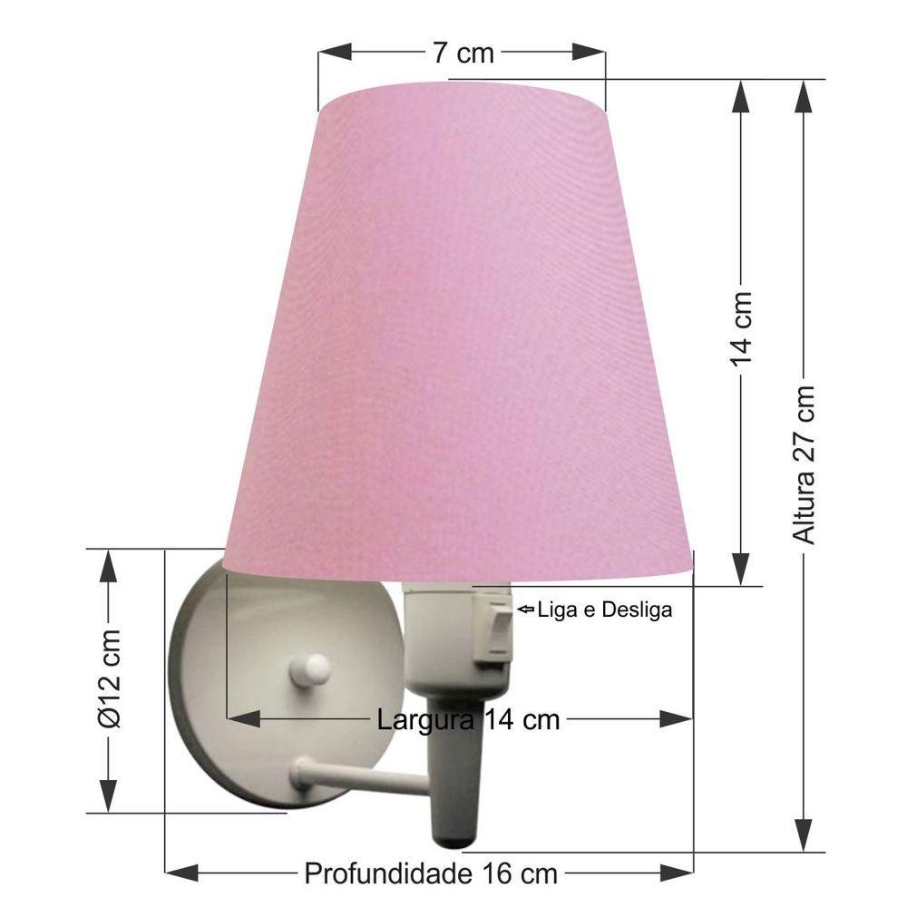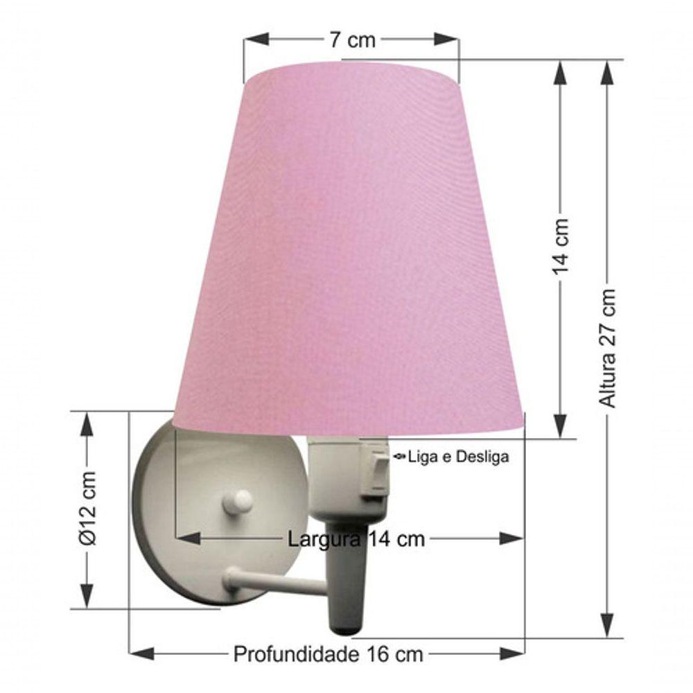 Kit/2 Arandela Cone Md-2013 Branco C/ Inter Liga E Desl Cúpula Em Tecido Rosa Bebê - BivoltKit/2 Arandela de parede Cone Md-2013 Branca C/ Inter Liga e Desl Cúpula Tecido Rosa BebêAs arandelas Lustres Vivare são elementos versáteis e elegantes que podem transformar qualquer ambiente em um espaço cheio de estilo. Seja para adicionar uma iluminação suave, destacar uma parede ou criar um efeito de luz diferenciado.Dimensão:Cúpula em Tecido: 14x07x14cmArandela de parede Montada: Altura 27cm Largura 14cm Profundidade 16cmFormato: ConeTamanho: PequenoEspecificação:Material: Cúpula em TecidoEstrutura em AlumínioBase Parede: Diâmetro 11x1,2cmResistente: Á MaresiaVoltagem: 110V/220VLiga e Desliga: Interruptor no SoqueteTipo de Soquete: E27Tipo de Lâmpada: Led Bulbo até 16w ou Fluorescente Espiral até 25w CadaCapacidade de Lâmpadas: 1Observação:Acompanha Lâmpada: NãoPossui Led Integrado: NãoGarantia: 12 MesesManual de Instalação: SimArandela de parede Montada: SimControle de Luminosidade: NãoTipo de Embalagem: CaixaConservação e Manutenção do Produto:A Limpeza deve ser realizada com o produto desligado. Remova o lustre que pode ser lavado com sabão neutro. Nunca utilize produtos químicos e abrasivosAntes de comprar o seu produto verifique as medidas, o local onde pretende instalar e se necessário o serviço de um profissional qualificado.