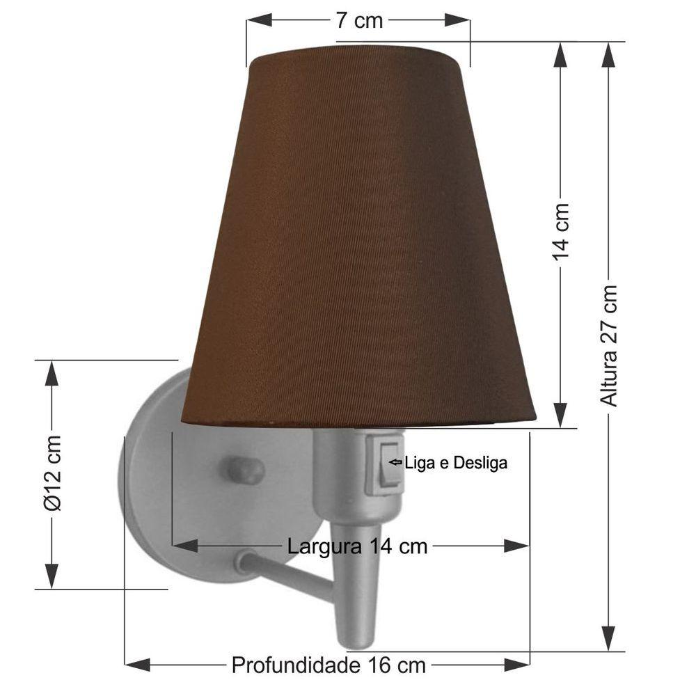 Arandela Cone Md-2013 Cinza C/ Inter Liga E Desl Cúpula Em Tecido Café - BivoltArandela de parede Cone Md-2013 Cinza C/ Inter Liga e Desl Cúpula Tecido CaféAs arandelas Lustres Vivare são elementos versáteis e elegantes que podem transformar qualquer ambiente em um espaço cheio de estilo. Seja para adicionar uma iluminação suave, destacar uma parede ou criar um efeito de luz diferenciado.Dimensão:Cúpula em Tecido: 14x07x14cmArandela de parede Montada: Altura 27cm Largura 14cm Profundidade 16cmFormato: ConeTamanho: PequenoEspecificação:Material: Cúpula em TecidoEstrutura em AlumínioBase Parede: Diâmetro 11x1,2cmResistente: Á MaresiaVoltagem: 110V/220VLiga e Desliga: Interruptor no SoqueteTipo de Soquete: E27Tipo de Lâmpada: Led Bulbo até 16w ou Fluorescente Espiral até 25w CadaCapacidade de Lâmpadas: 1Observação:Acompanha Lâmpada: NãoPossui Led Integrado: NãoGarantia: 12 MesesManual de Instalação: SimArandela de parede Montada: SimControle de Luminosidade: NãoTipo de Embalagem: CaixaConservação e Manutenção do Produto:A Limpeza deve ser realizada com o produto desligado. Remova o lustre que pode ser lavado com sabão neutro. Nunca utilize produtos químicos e abrasivosAntes de comprar o seu produto verifique as medidas, o local onde pretende instalar e se necessário o serviço de um profissional qualificado.